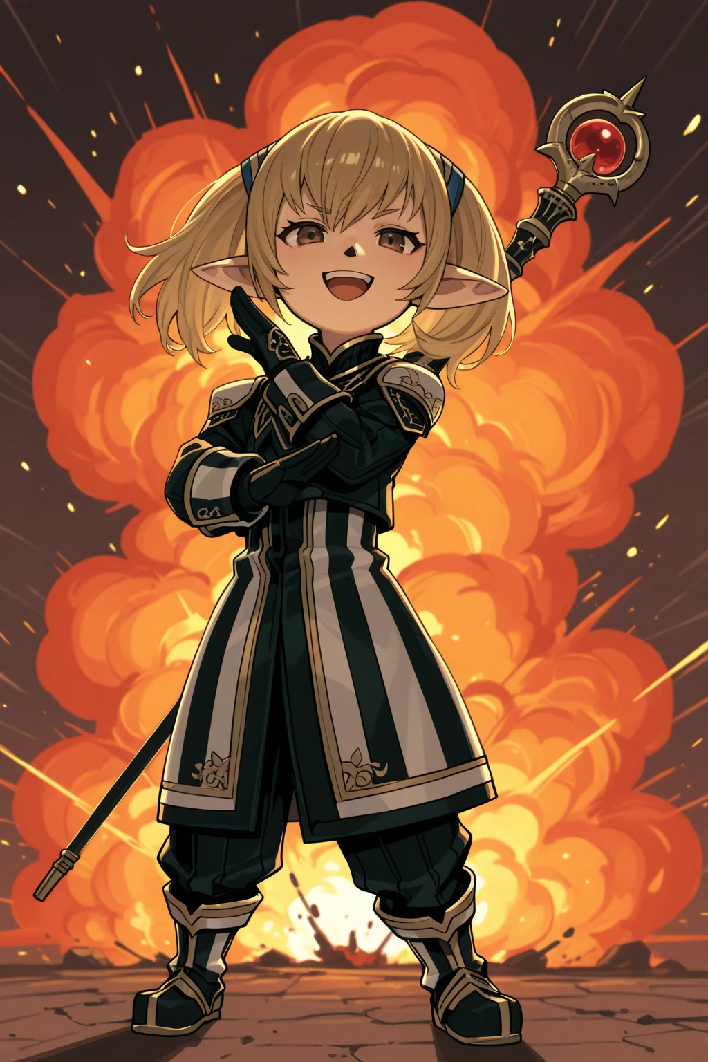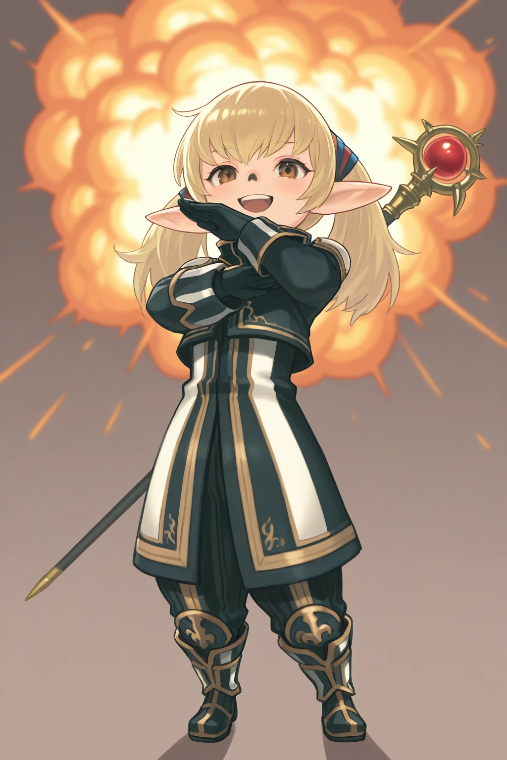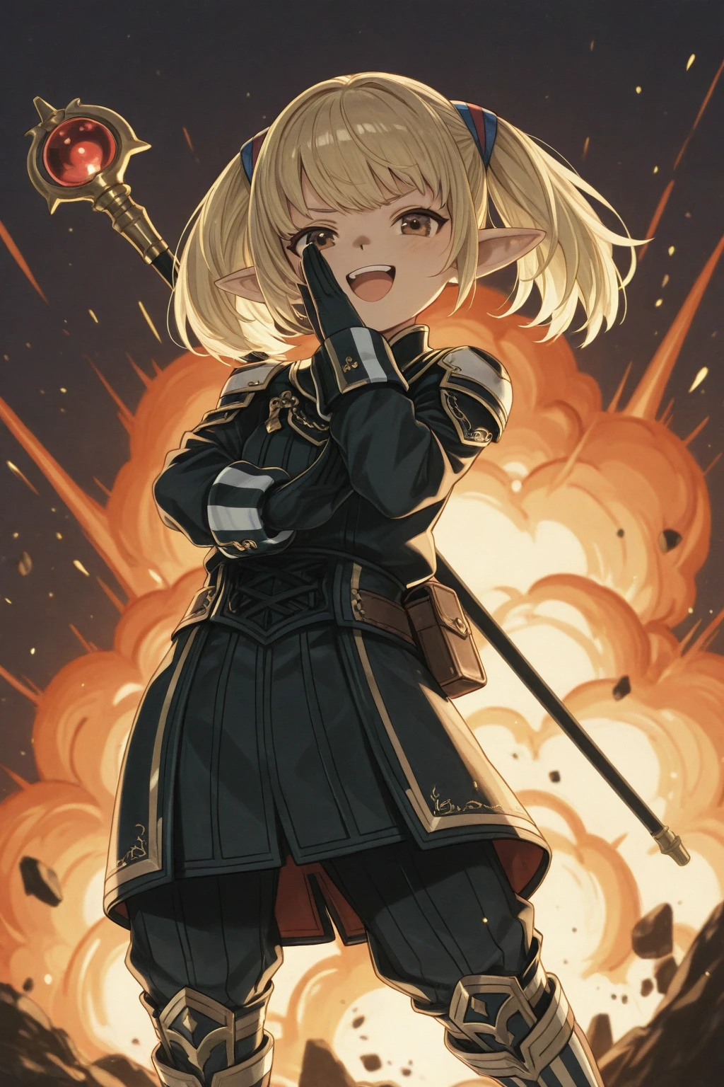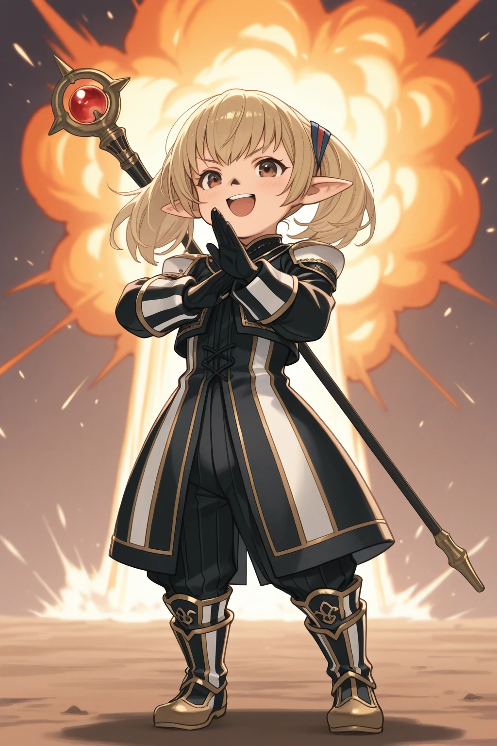 xishantotto, 1girl, solo, tarutaru, short, black nose, pointy ears, brown eyes, blonde hair, twintails,Default Outfit