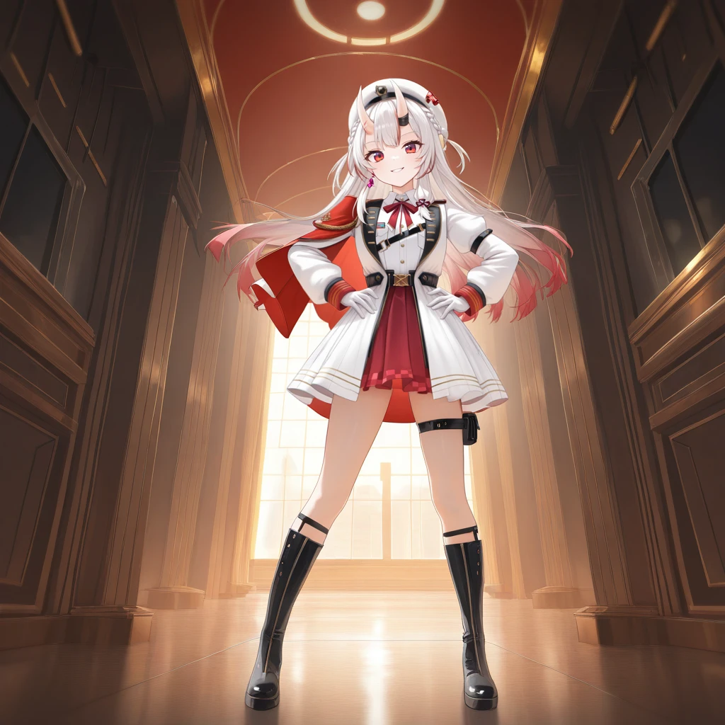 NakAya, Nka_Mlt, nakiri ayame, white hair, long hair, braid, gradient hair, red eyes, red streaks, streaked hair, horns, skin-covered horns, military uniform, uniform, white jacket, open jacket, chest strap, collared dress, white dress, buttons, black belt, belt buckle, red ribbon, neck ribbon, side cape, red cape, puffy sleeves, black sleeve cuffs, white sleeves, sleeve garter, black trim, skirt under dress, red skirt, white gloves, gloves, white headwear, beret, x hair ornament, hairclip, thigh pouch, black thigh strap, legwear garter, knee boots, black boots,