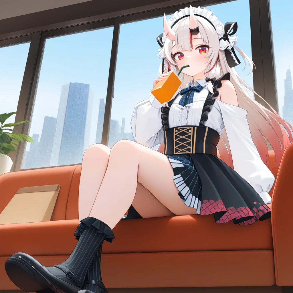 NakAya, Nka_Cas01, nakiri ayame, white hair, long hair, gradient hair, red eyes, red streaks, streaked hair, horns, skin-covered horns, off-shoulder shirt, white shirt, frilled shirt, shoulder cutout, clothing cutout, plaid bow, hair bow, blue bowtie, bow ribbon, frilled collar, center frills, black corset, corset, puffy long sleeves, white sleeves, frilled headdress, hair ribbon, bare shoulders, vertical-striped skirt, black skirt, layered skirt, two-tone skirt, black ribbon, sleeve cuffs, suspender skirt, black mary janes, mary janes, black socks, frilled socks, striped socks,