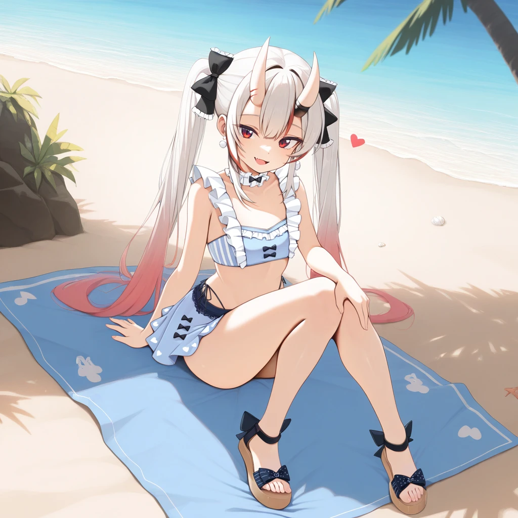 NakAya, Nka_Swm01, nakiri ayame, white hair, long hair, gradient hair, red eyes, red streaks, streaked hair, twintails, horns, skin-covered horns, light blue bikini, frilled bikini, swimsuit, black bow, earrings, heart print, vertical-striped bikini, lace-trimmed skirt, light blue skirt, bikini skirt, panty straps, side-tie bikini bottom, frilled choker, white choker, hair bow, footwear bow, black ankle strap, sandals, light brown footwear,