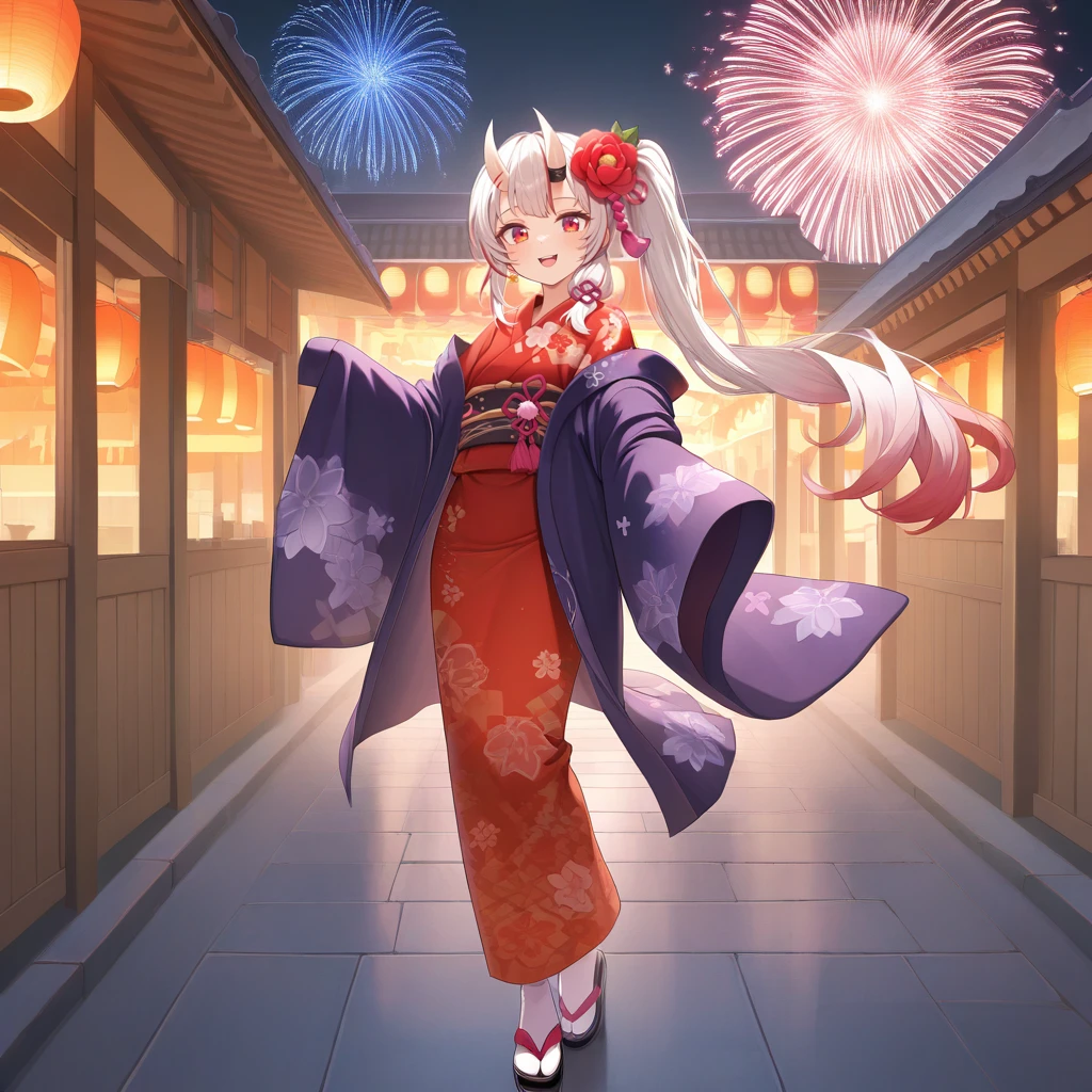 NakAya, Nka_Ykt, nakiri ayame, white hair, very long hair, gradient hair, red eyes, red streaks, streaked hair, horns, skin-covered horns, side ponytail, braid, flower hair ornament, red flower, pink tassel, red yukata, yukata, obi, floral print, purple haori, open clothes, off-shoulder haori, haori, sleeves past fingers, kanzashi, v-neck, black footwear, tabi, white socks, zouri,