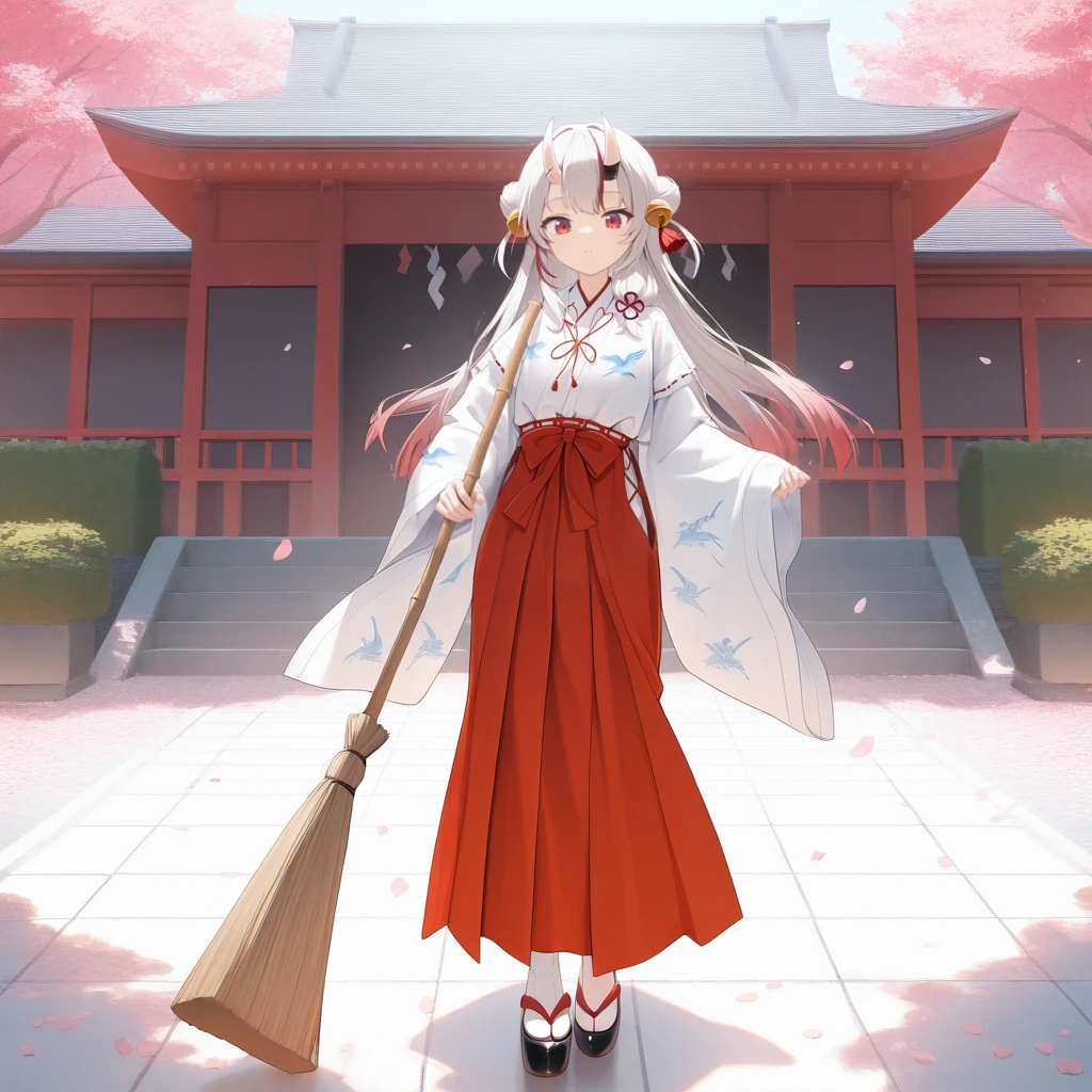 NakAya, Nka_Miko01, nakiri ayame, white hair, long hair, gradient hair, red eyes, red streaks, streaked hair, horns, skin-covered horns, hair bun, double bun, side bun, hair bell, hair tassel, oni mask, mask on head, hair flower, hair ornament, miko, japanese clothes, chihaya_(clothing), white chihaya, animal print, red skirt, hakama skirt, red ribbon, chest ribbon, red tassel, bird print, wide sleeves, white sleeves, sleeves past wrists, okobo, black footwear, tabi, white socks, platform sandals,