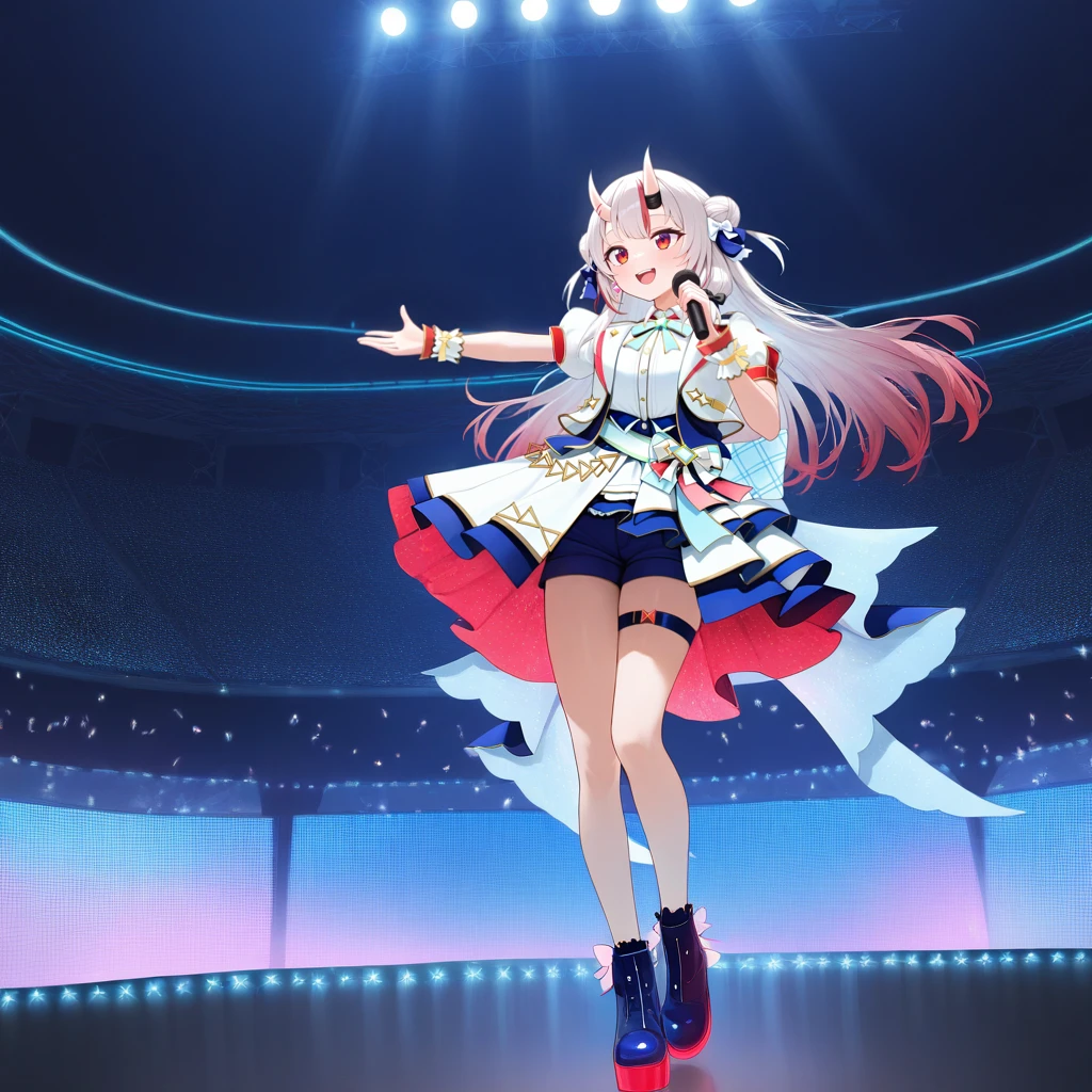 NakAya, Nka_Idl01, nakiri ayame, white hair, long hair, gradient hair, red eyes, red streaks, streaked hair, horns, skin-covered horns, hair bun, double bun, hololive idol uniform (bright), idol clothes, white bow, hair bow, blue ribbon, blue vest, vest, cropped jacket, white jacket, short puffy sleeves, dress shirt, white shirt, light blue bowtie, waist sash, waist bow, pink bow, back bow, large bow, two-sided skirt, shorts under skirt, blue shorts, white skirt, frilled skirt, frilled wrist cuffs, blue thigh strap, platform boots, blue footwear, red colored shoe sole, ankle boots, footwear bow,