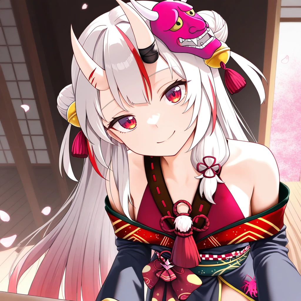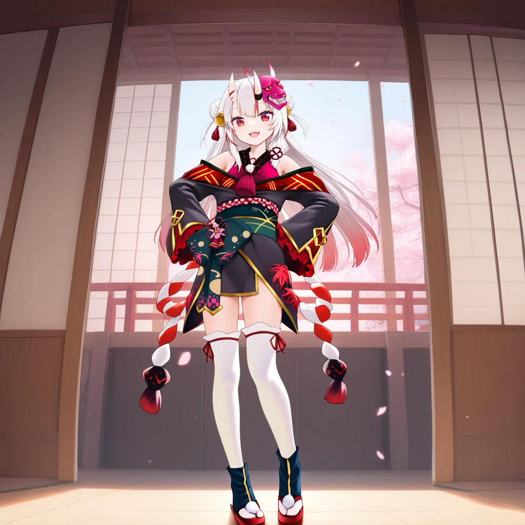 NakAya, Nka_Def, nakiri ayame, white hair, long hair, gradient hair, red eyes, hair bun, red streaks, streaked hair, double bun, horns, skin-covered horns, hair bell, bare shoulders, pom pom (clothes), red ribbon, hair tassel, oni mask, mask on head, low-side ponytail, off-shoulder kimono, short kimono, black kimono, gold trim, maroon shirt, sleeveless shirt, v-neck, green sash, rope, obiage, obijime, maroon bow, waist bow, shirt under kimono, frilled sleeves, black sleeves, two-sided fabric, red tassel, white thighhighs, kouhaku nawa, ribbon-trimmed thighhighs, socks over thighhighs, red footwear, pom pom footwear, okobo, black socks, toeless socks,