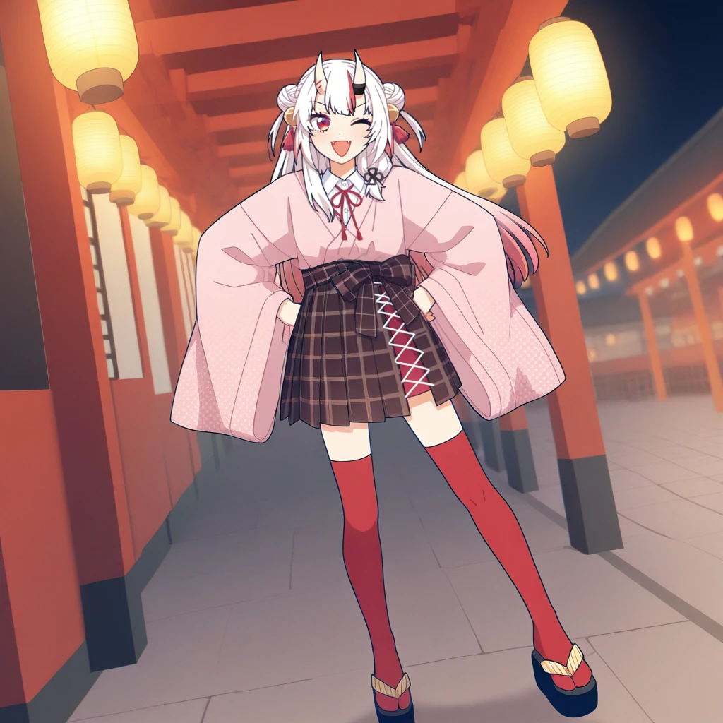 NakAya, Nka_Jnb, nakiri ayame, white hair, long hair, gradient hair, red eyes, red streaks, streaked hair, horns, skin-covered horns, hair bun, double bun, jinbei_(clothes), light pink kimono, kimono, white shirt, collared shirt, neck ribbon, red ribbon, ribbon trim, wide sleeves, light pink sleeves, layered sleeves, plaid skirt, high-waist skirt, parallel hairclips, red hairclip, cross-laced skirt, dark brown skirt, plaid bow, large bow, waist bow, dark brown bow, red thighhighs, thighhighs, hair bell, hair tassel, red tassel, low-side ponytail, zouri, black footwear, platform sandals,