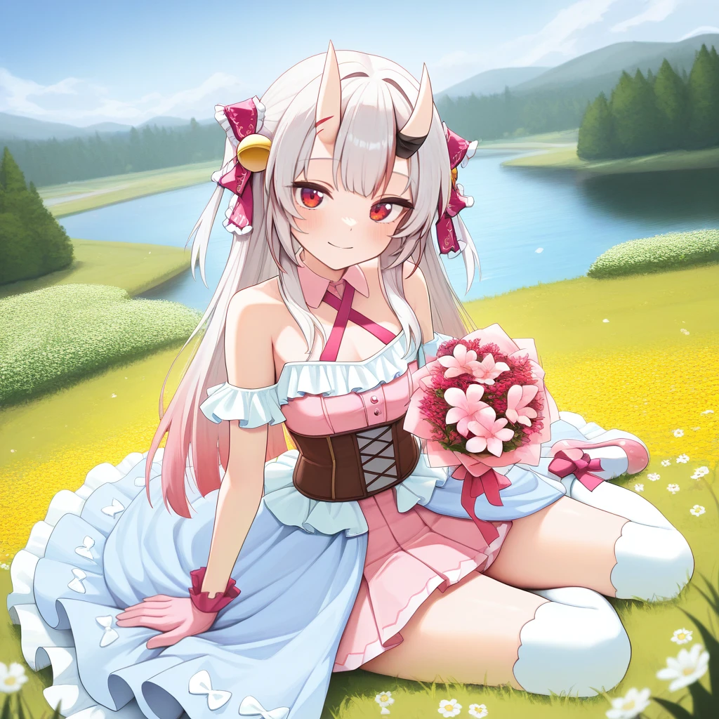 NakAya, Nka_Frl, nakiri ayame, white hair, long hair, gradient hair, red eyes, red streaks, streaked hair, horns, skin-covered horns, halter dress, light pink dress, cross-laced corset, brown corset, frills, magenta ribbon, frilled dress, layered skirt, pleated skirt, light pink skirt, light blue overskirt, overskirt, thigh garter, white trim, white frills, white armband, white over-kneehighs, over-kneehighs, frilled armband, light pink gloves, frilled gloves, frilled hair tie, frilled ribbon, hair ribbon, light pink collar, collared collar, detached collar, criss-cross halter, bare shoulders, light pink footwear, ankle bow, magenta bow, shoes,
