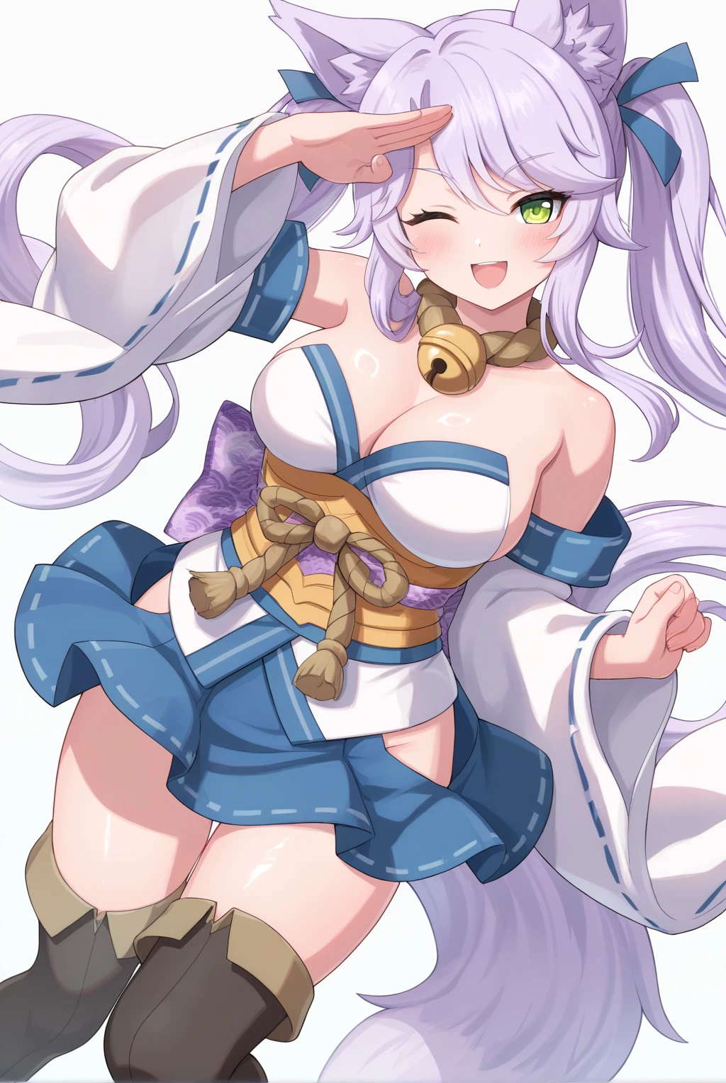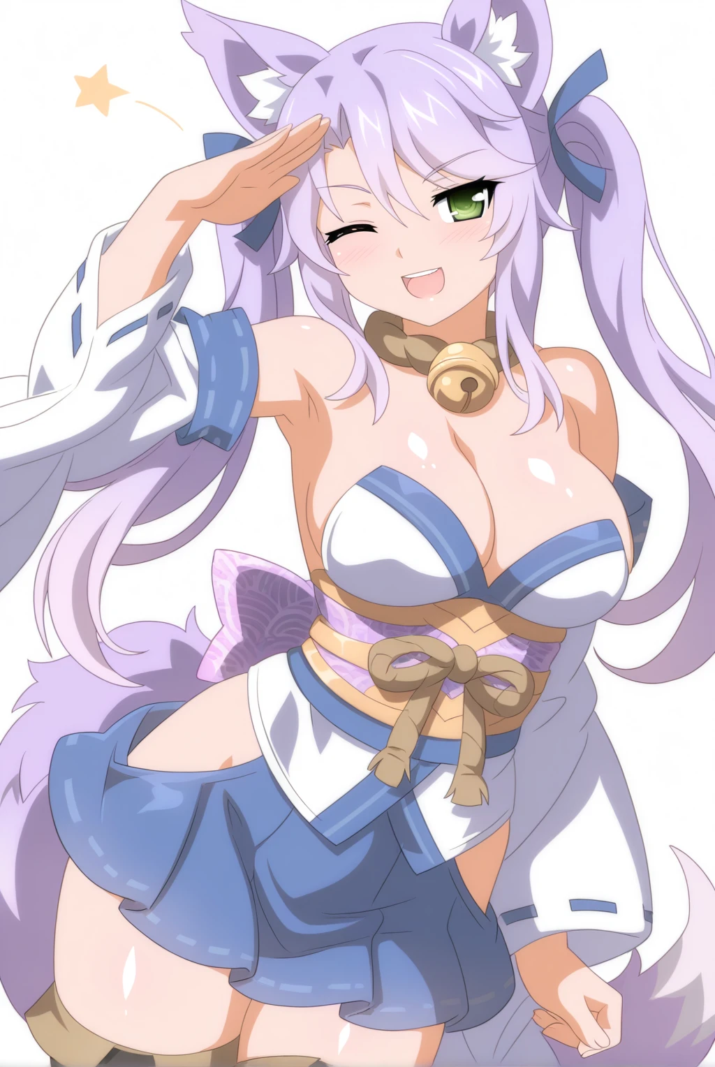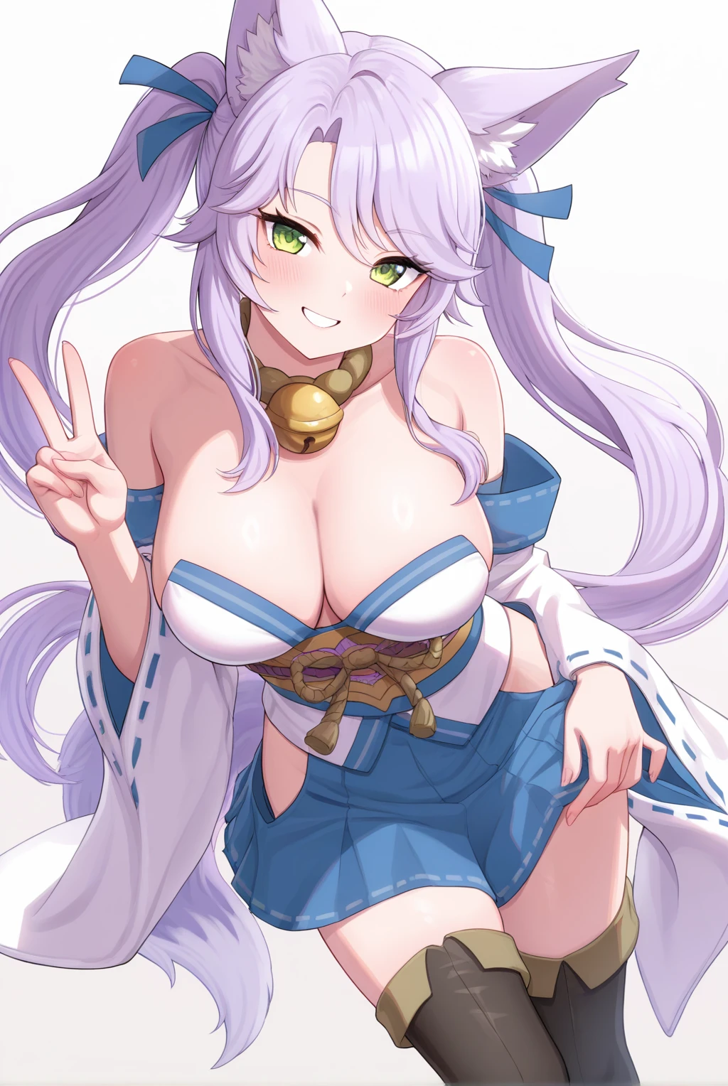 Appearance: fox_miko_(sakura_dungeon), fox girl, green eyes, long hair, light purple hair, bangs, twintails, blue ribbon, hair ribbon, large breasts, animal ear fluff, fox ears, animal ears, fox tail