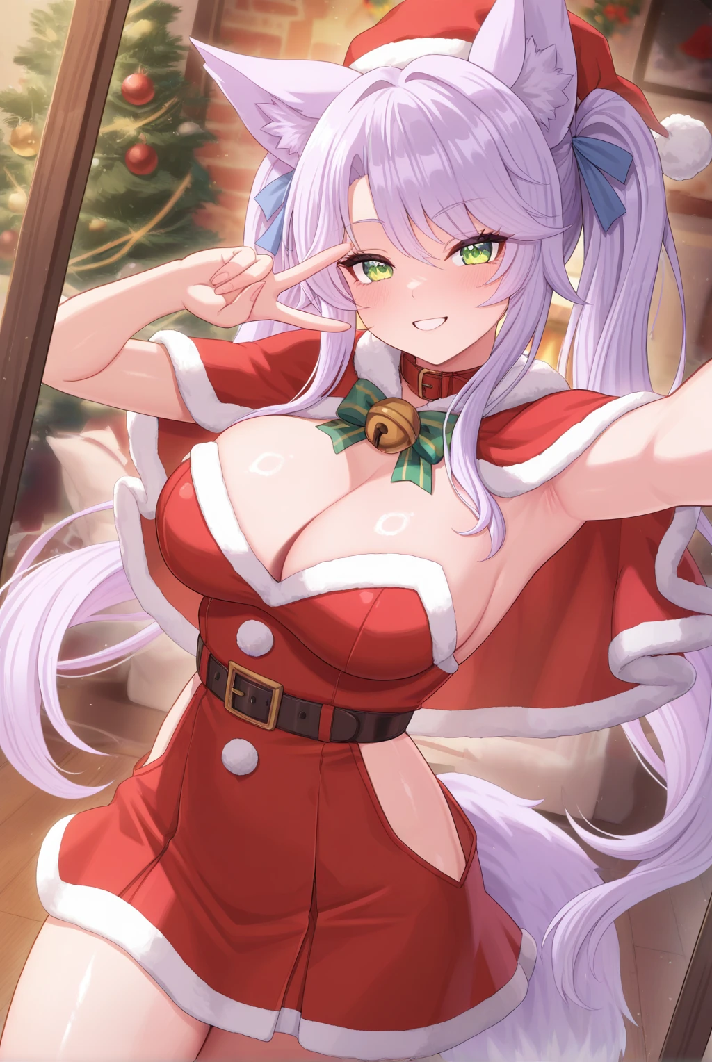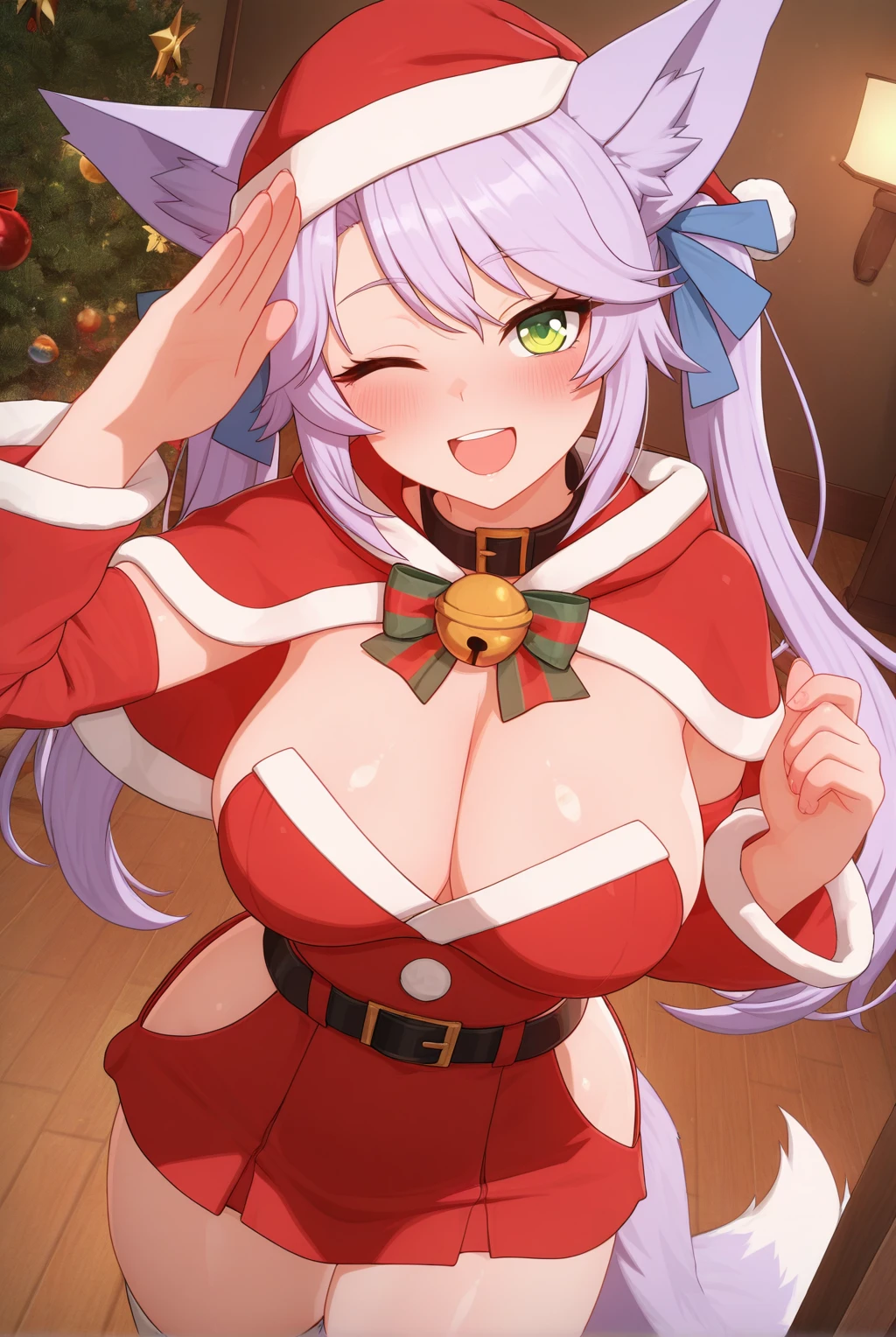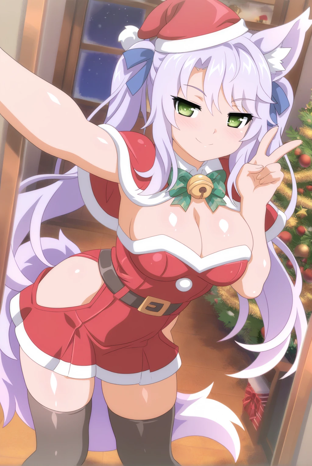 Appearance: fox_miko_(sakura_dungeon), fox girl, green eyes, long hair, light purple hair, bangs, twintails, blue ribbon, hair ribbon, large breasts, animal ear fluff, fox ears, animal ears, fox tail