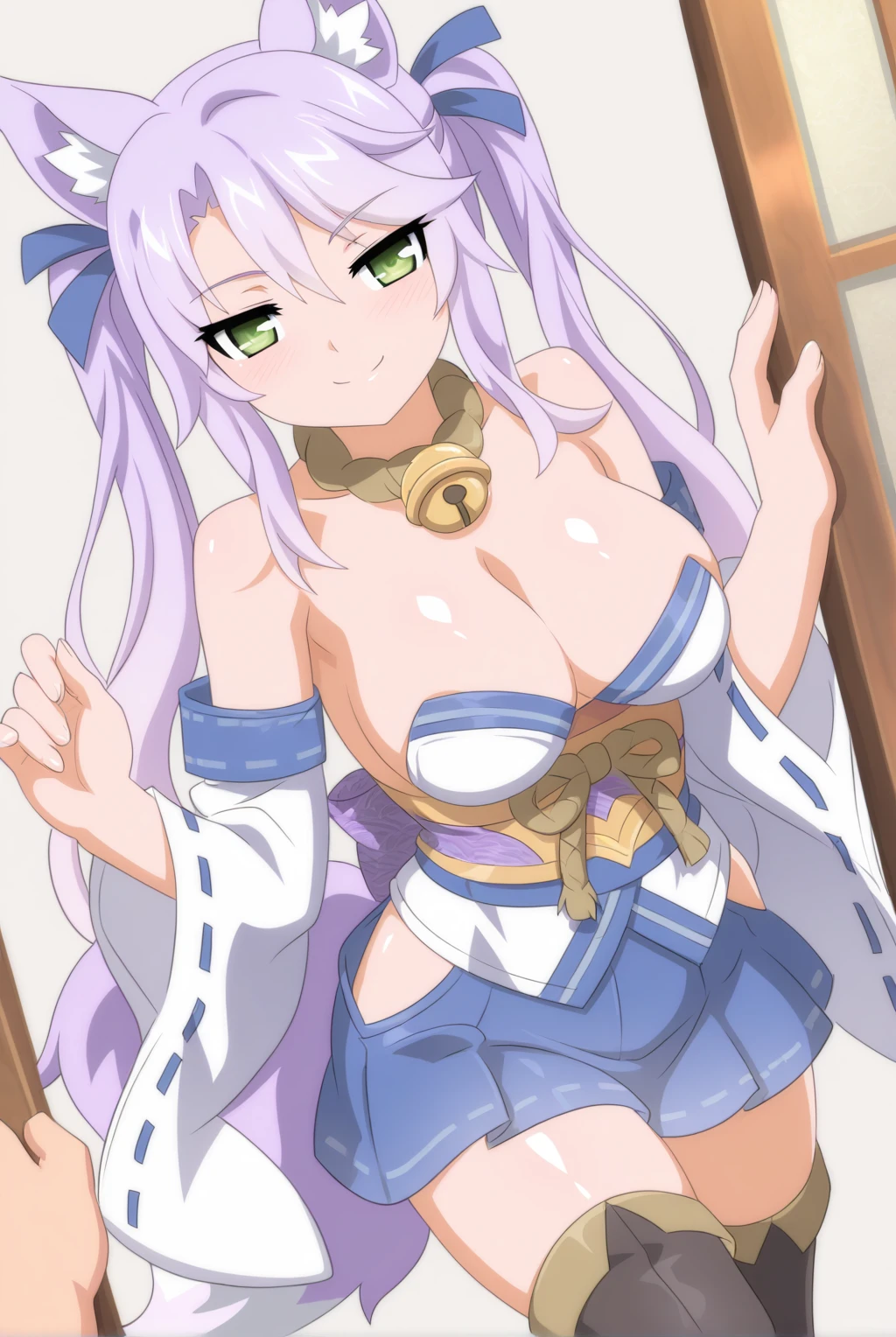 Outfit: collar, jingle bell, ribbon trim, ribbon-trimmed_sleeves, long sleeves, wide sleeves, cleavage, bare shoulders, detached sleeves, obi, sash, hip vent, blue skirt, pleated skirt, black thighhighs, japanese clothes
