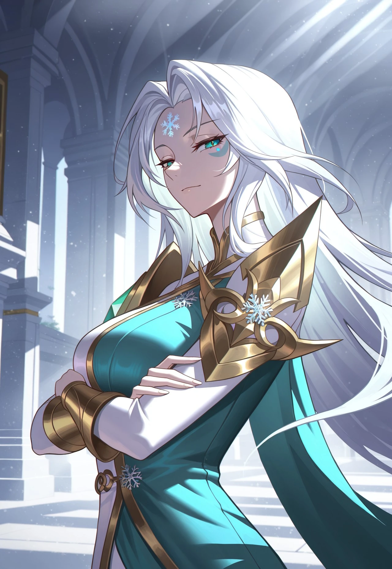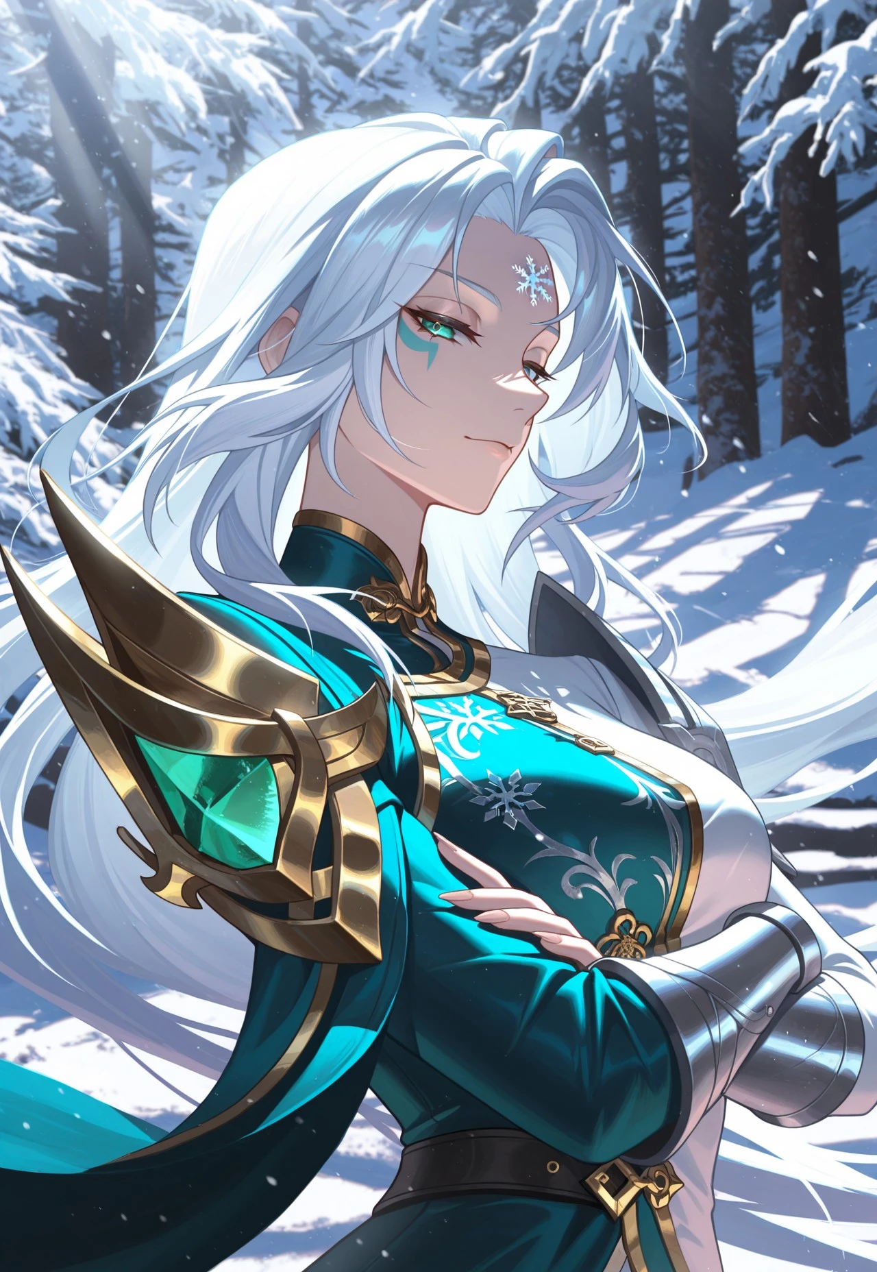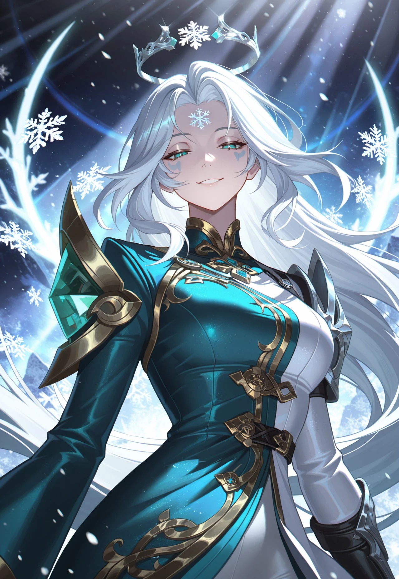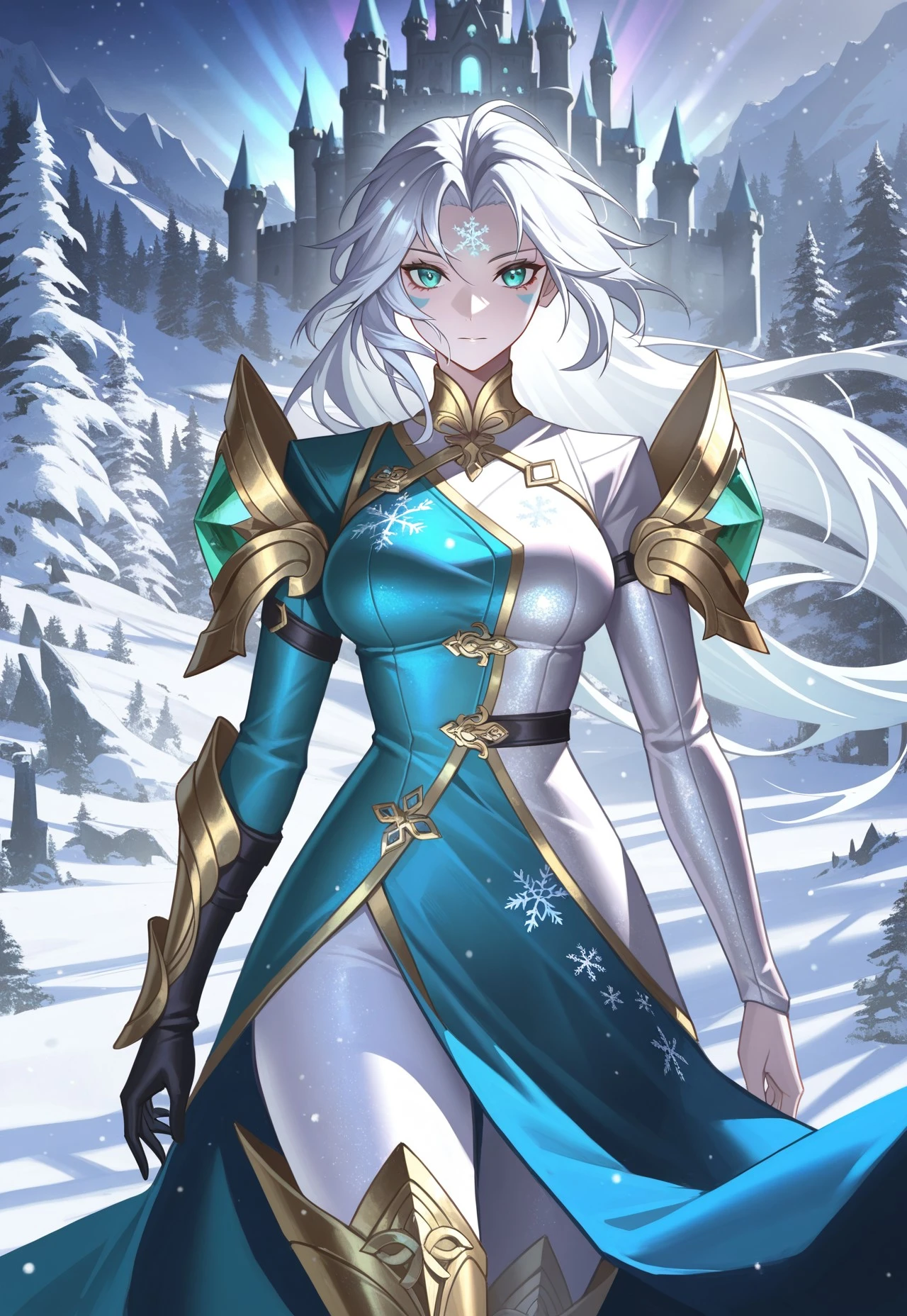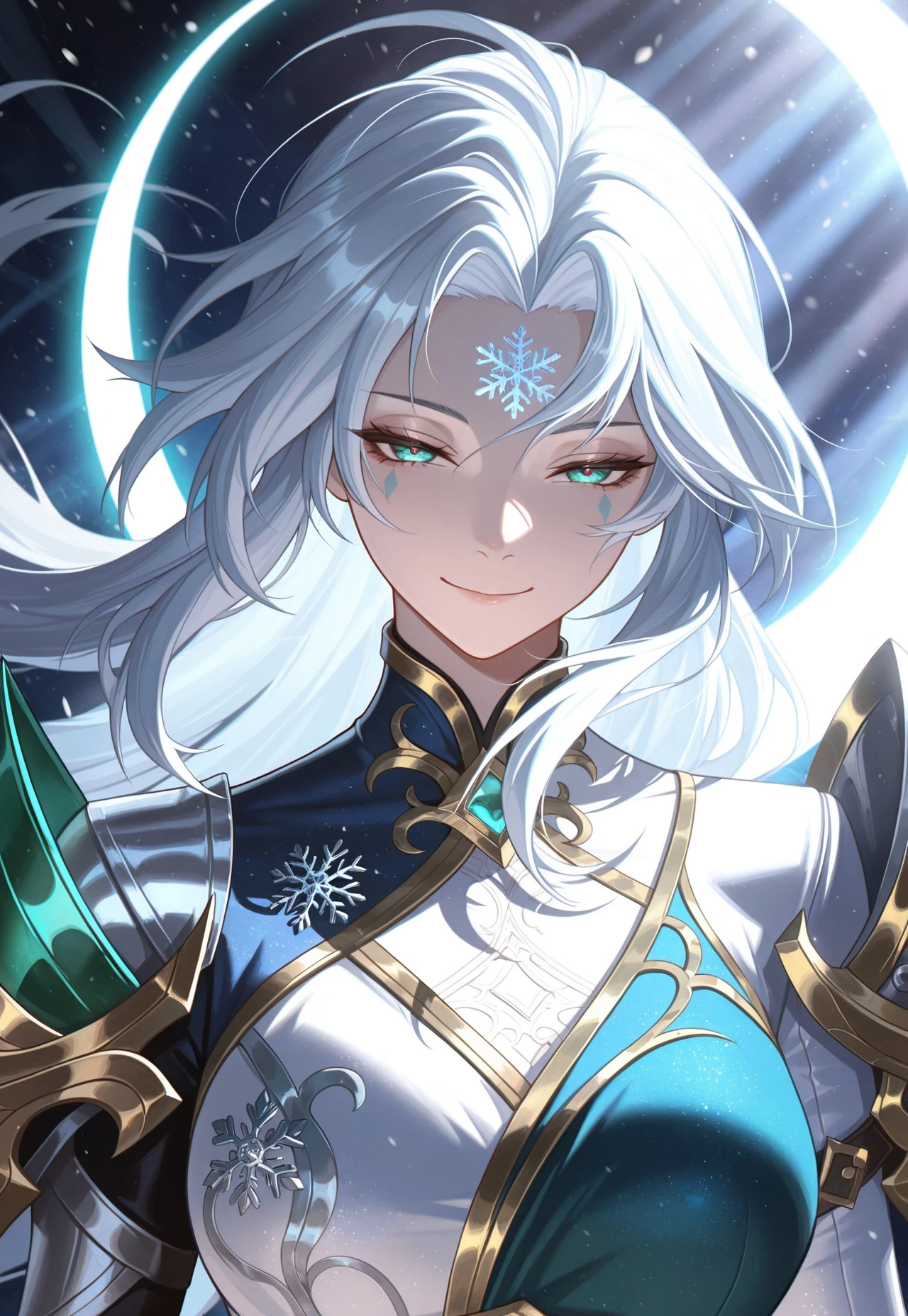 WBDiana, long hair, white hair, emerald eyes, snowflake mark on forehead, facial mark, blue and gold dress, silver and gold armor, white pantyhose, high knee boots, crescent blade
