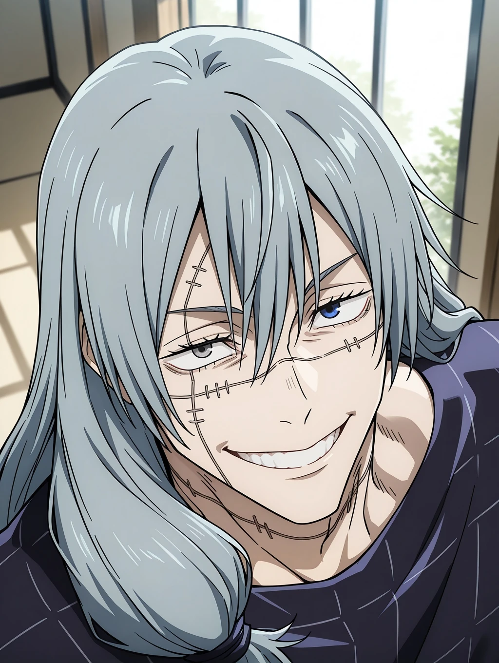 Mahito, mahito (jujutsu kaisen), grey hair, heterochromia, grey eyes, blue eyes, stitched face, long hair, hair tie, sitchesClothes: