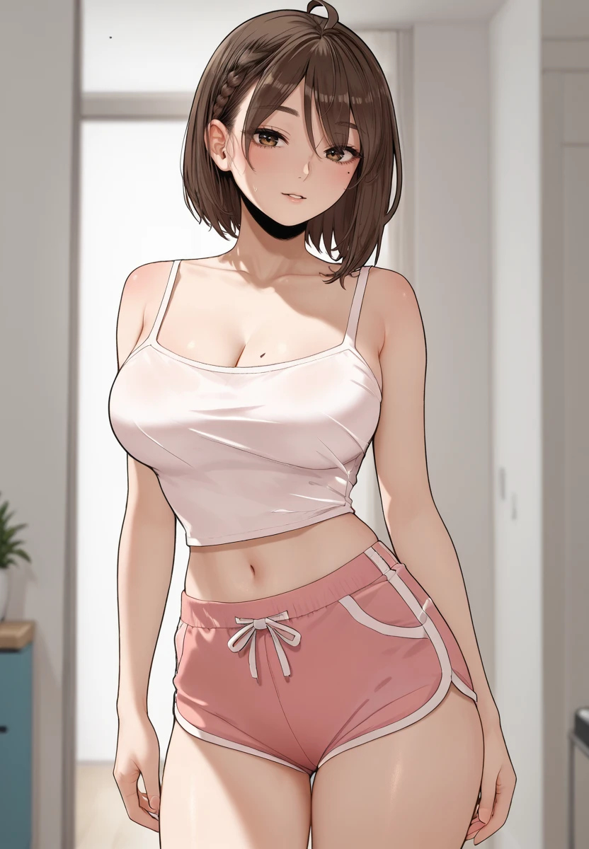 kimyura, 1girl, brown hair, brown eyes, braid, mole on breast,