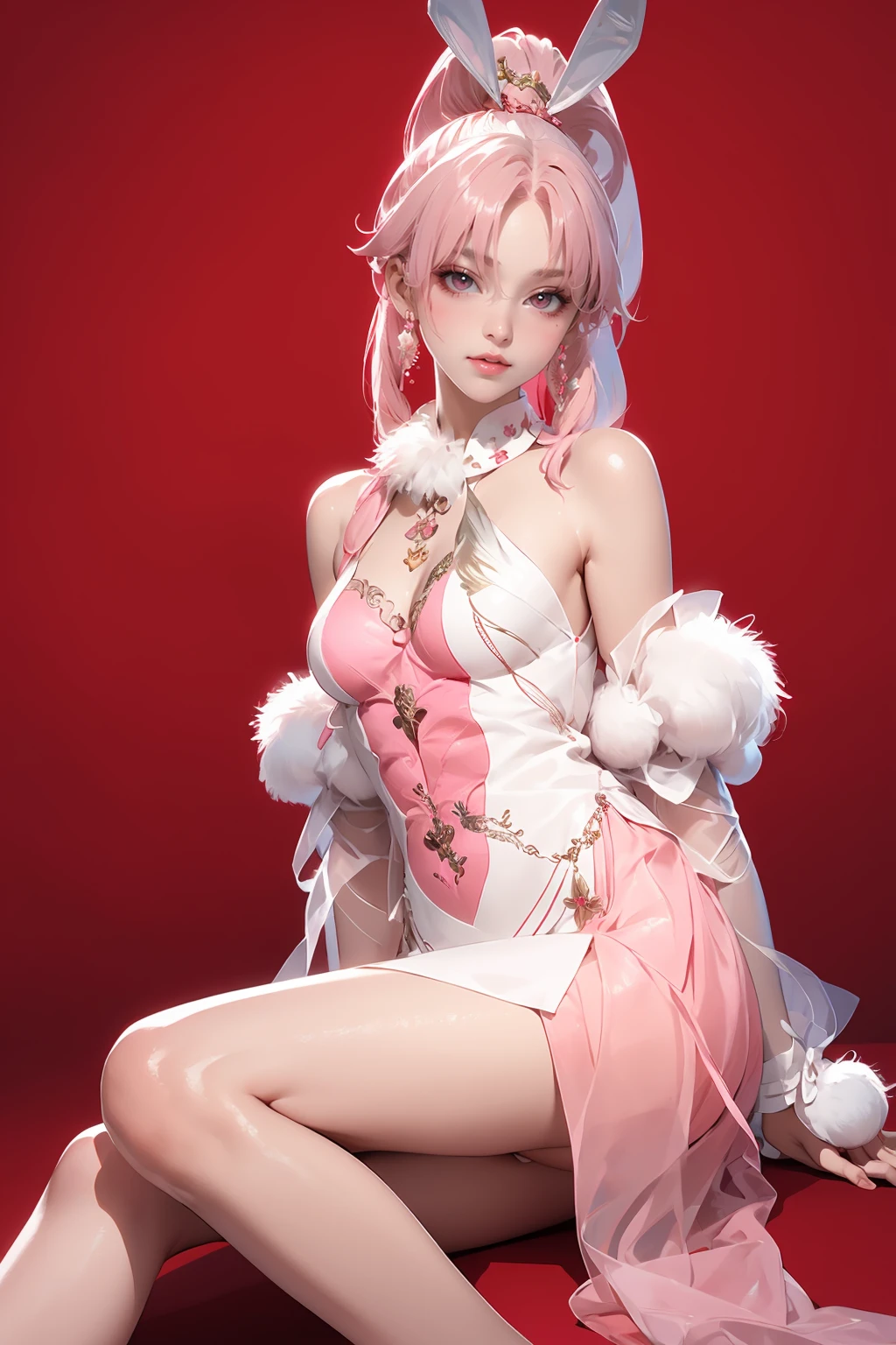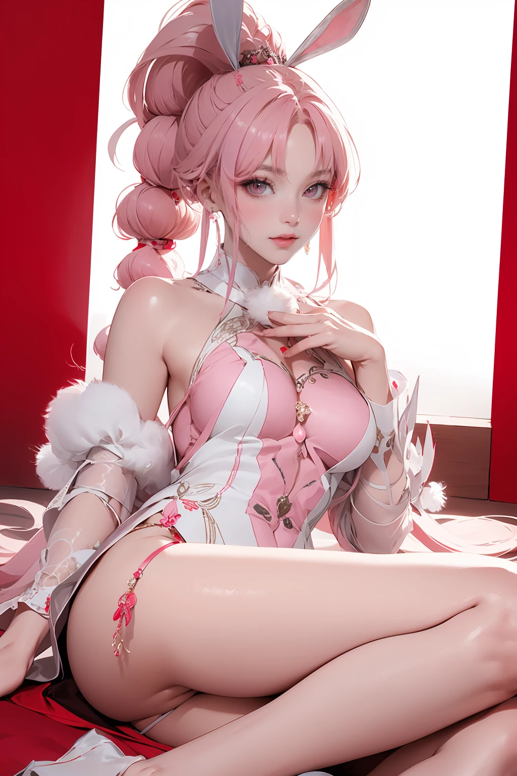 xiaowu,braided ponytail,clothing cutout,detached sleeves,feather hair ornament,jewelry,rabbit ears,pink hair,