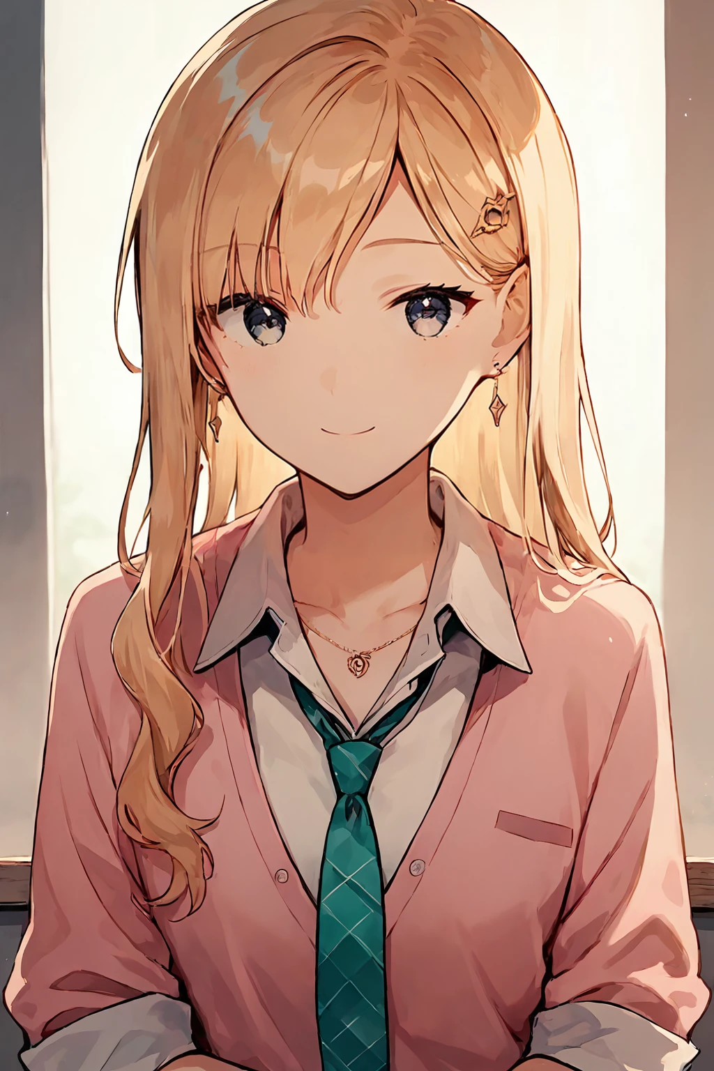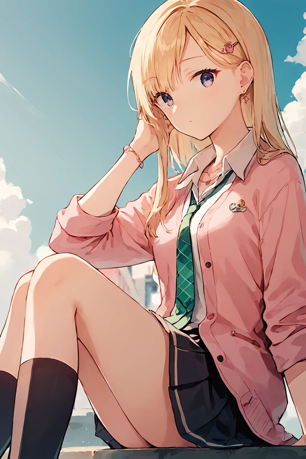 pink cardigan,white shirt,collared shirt,sleeve_rolled_up,black skirt,pleated skirt,black socks,kneehighs,black footwear,loafers,green necktie,jewelry,necklace,hair ornament,earrings,hairclip,