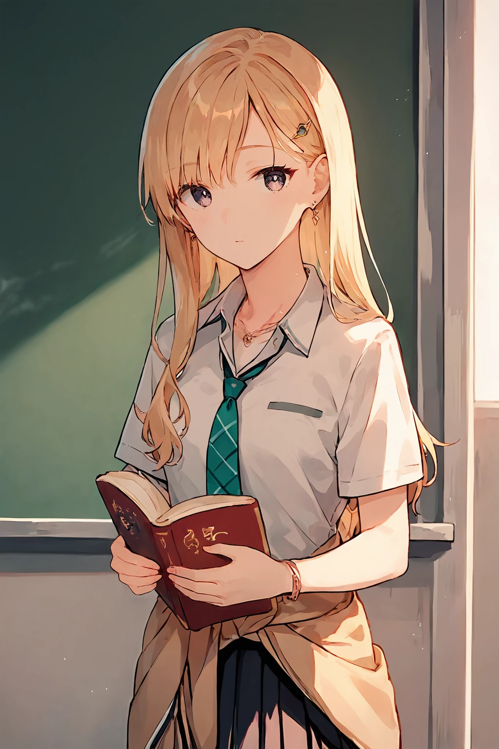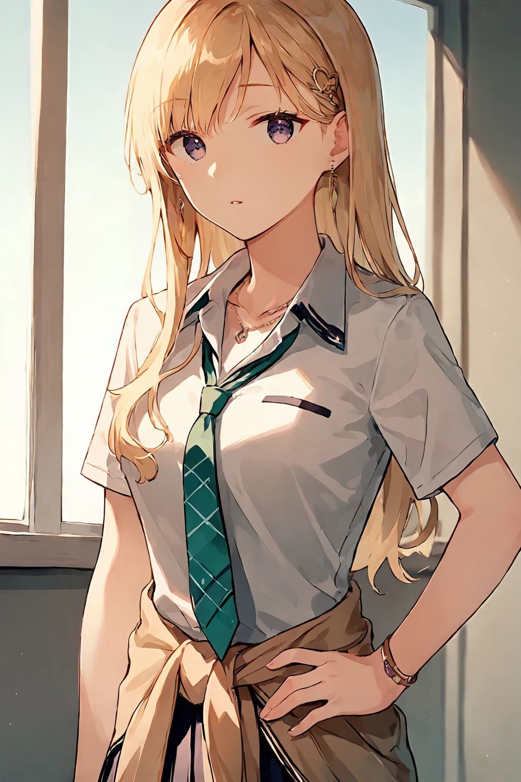 school uniform,white shirt,short sleeves,pleated skirt,black skirt,black socks,black footwear,loafers,green necktie,clothes around waist,earrings,necklace,jewelry,hair ornament,School Uniform 2: