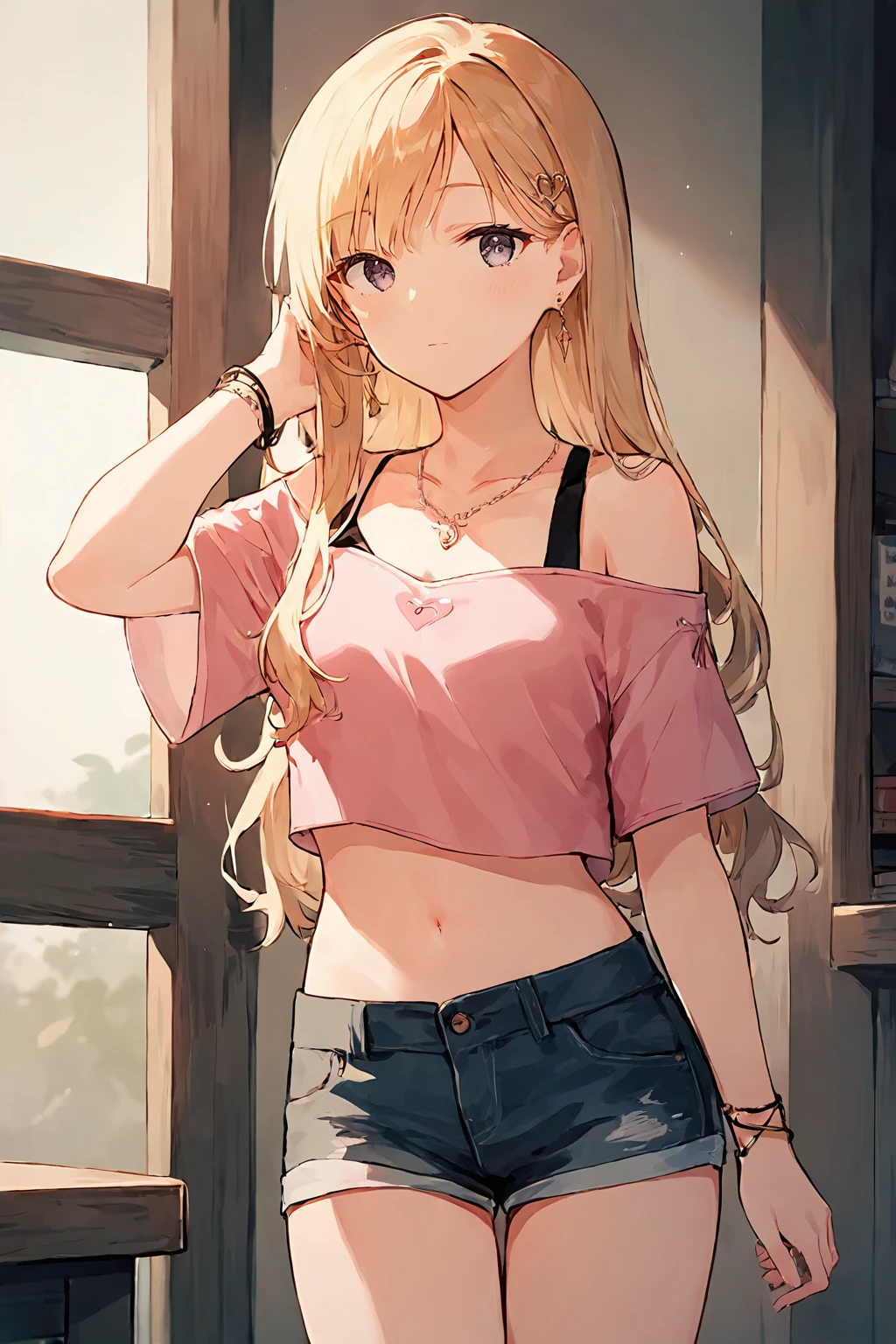 pink shirt,off-shoulder shirt,short sleeves,crop top,off shoulder,black shoulder strap,denim shorts,short shorts,jewelry,earrings,necklace,hair ornament,bracelet,navel,midriff,Description
