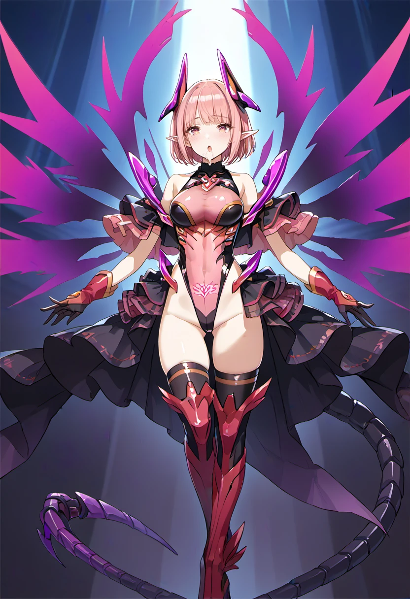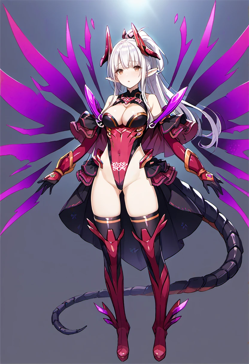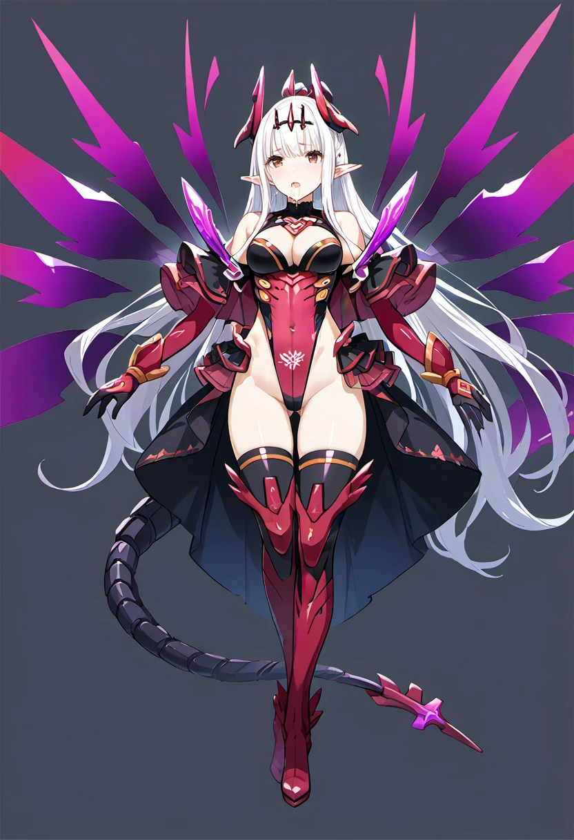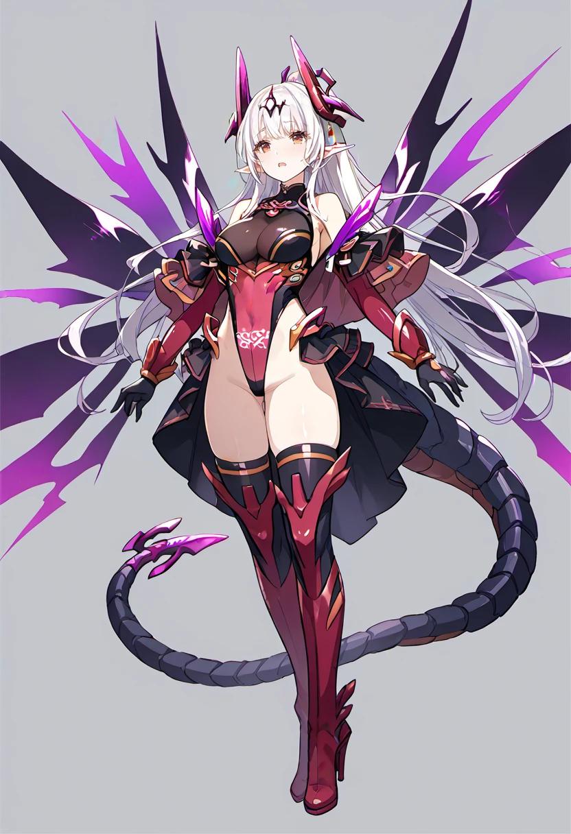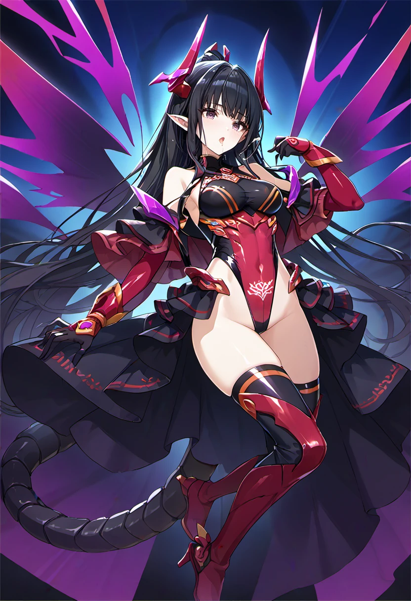 leotard,thighhighs,horns,wings,gloves,dargon tail,tattoo,highleg leotard,dress,showgirl skirt,boots,bare shoulders,high heel boots,mechanical tail,corruption,high heels,pointy ears,ponytail,