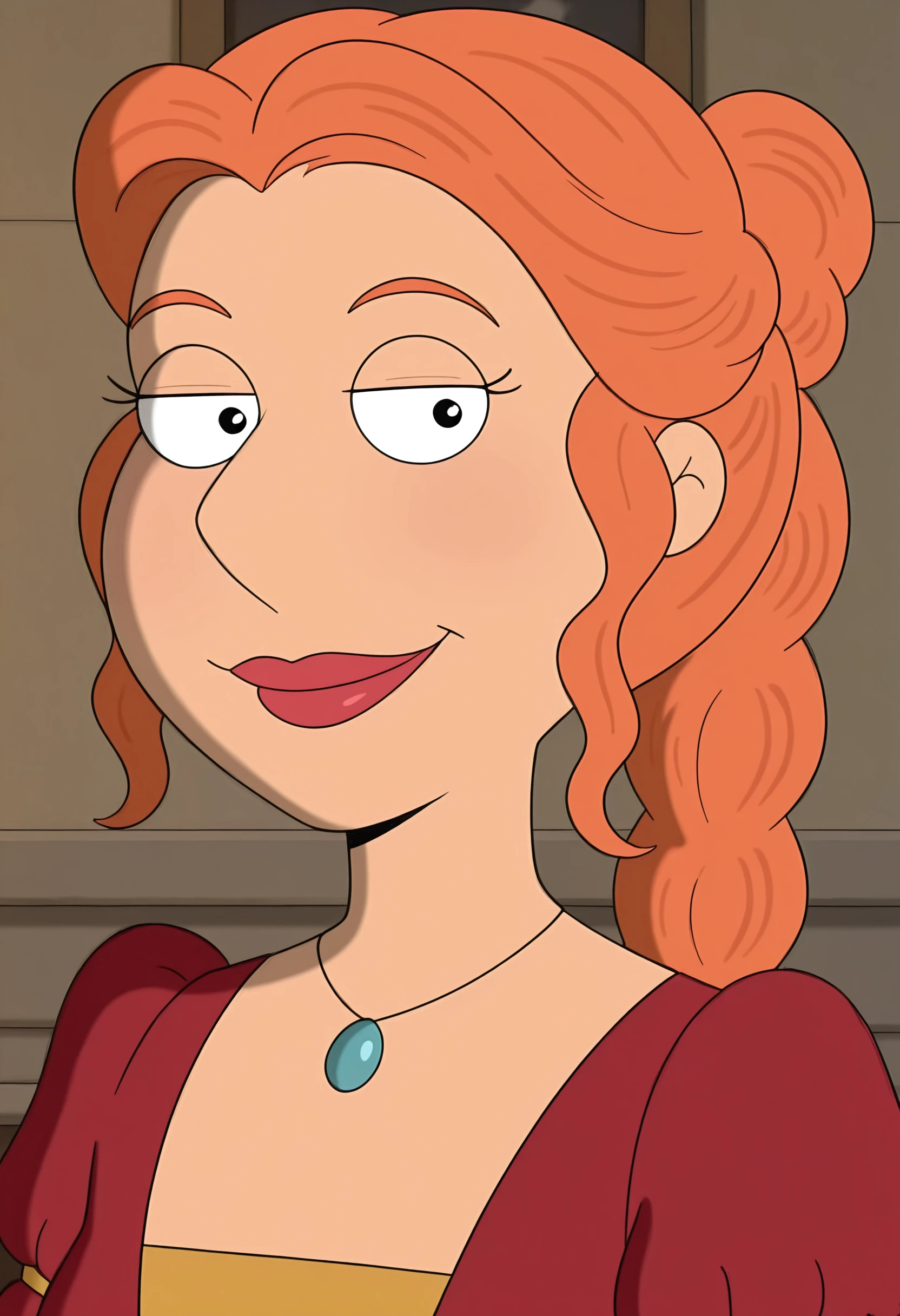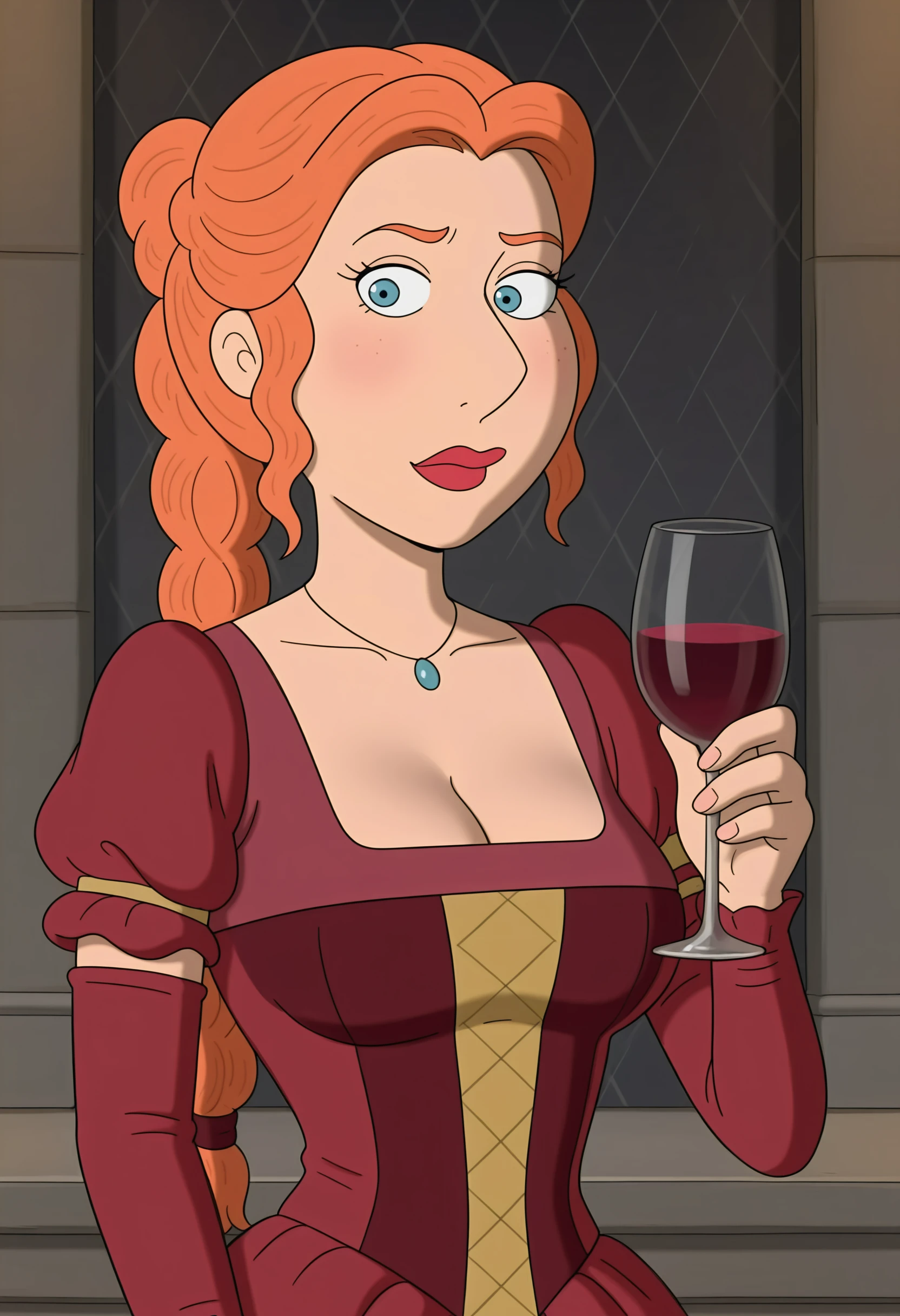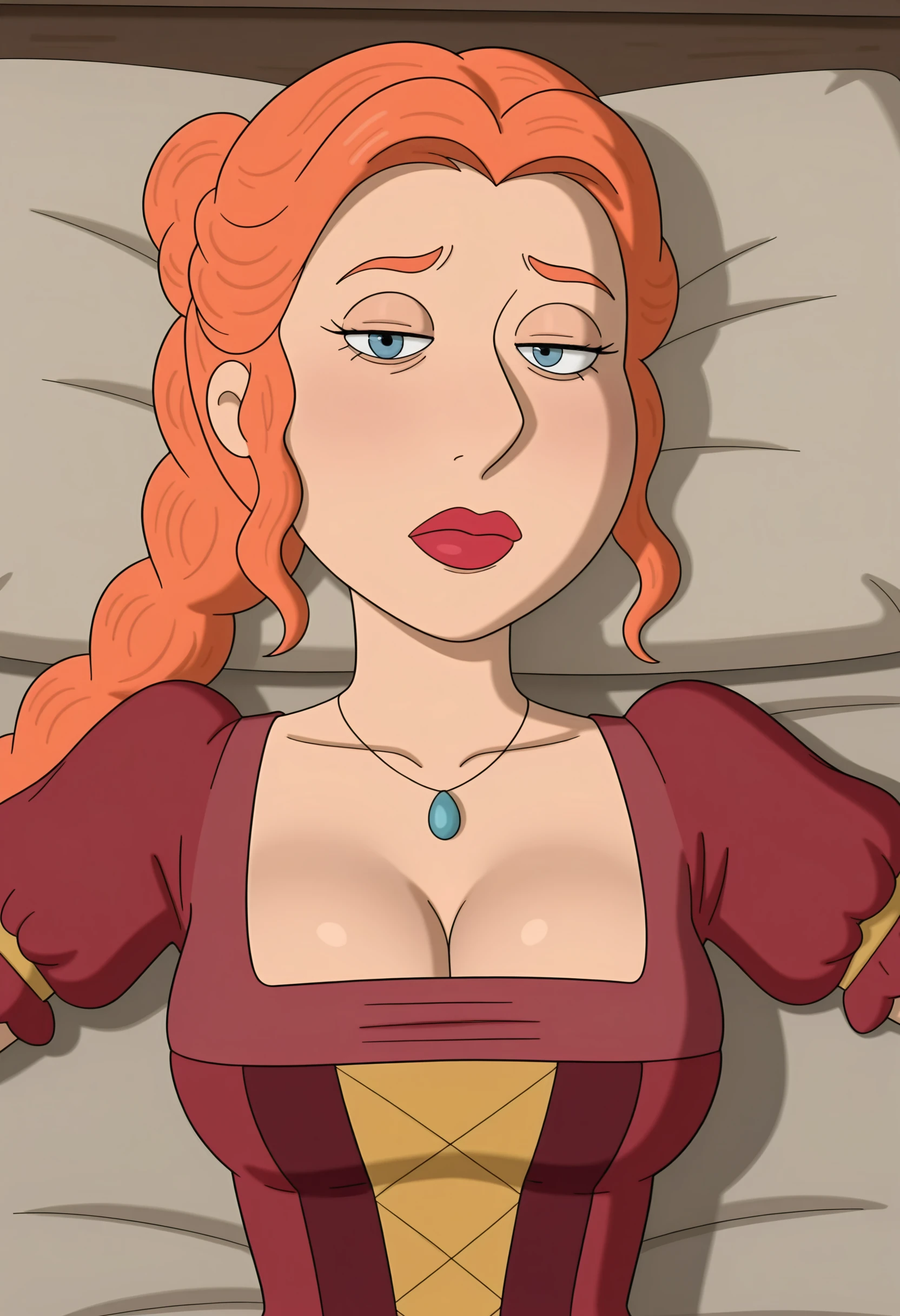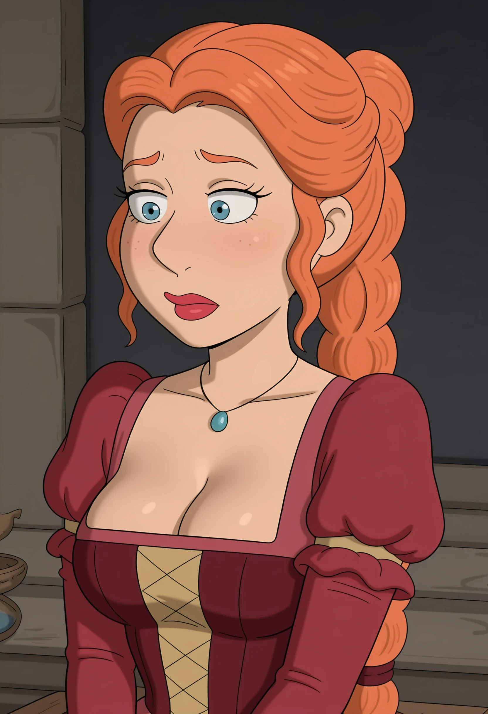 ljilf, orange hair, braid, red dress, necklace, breasts, cleavage