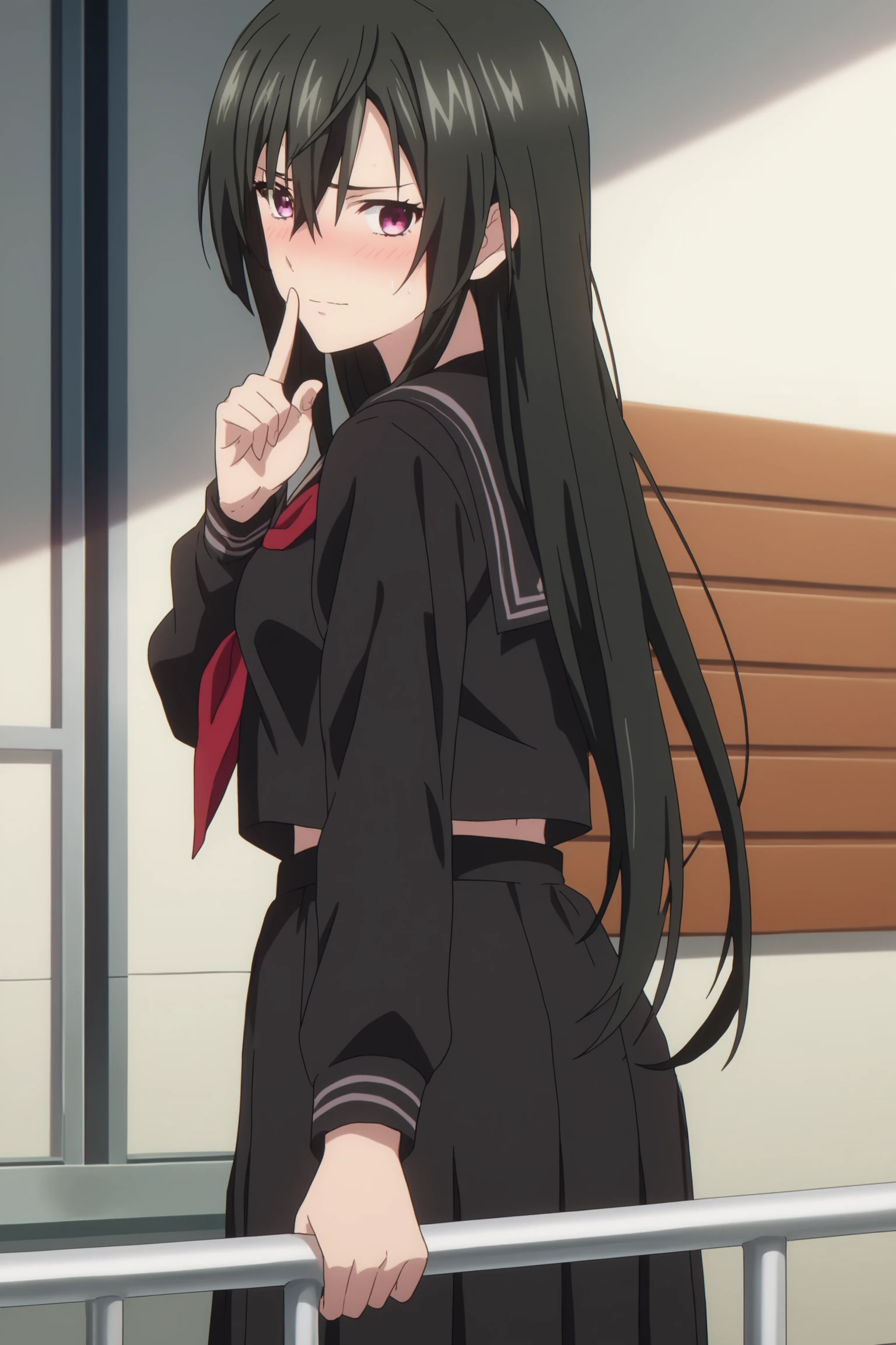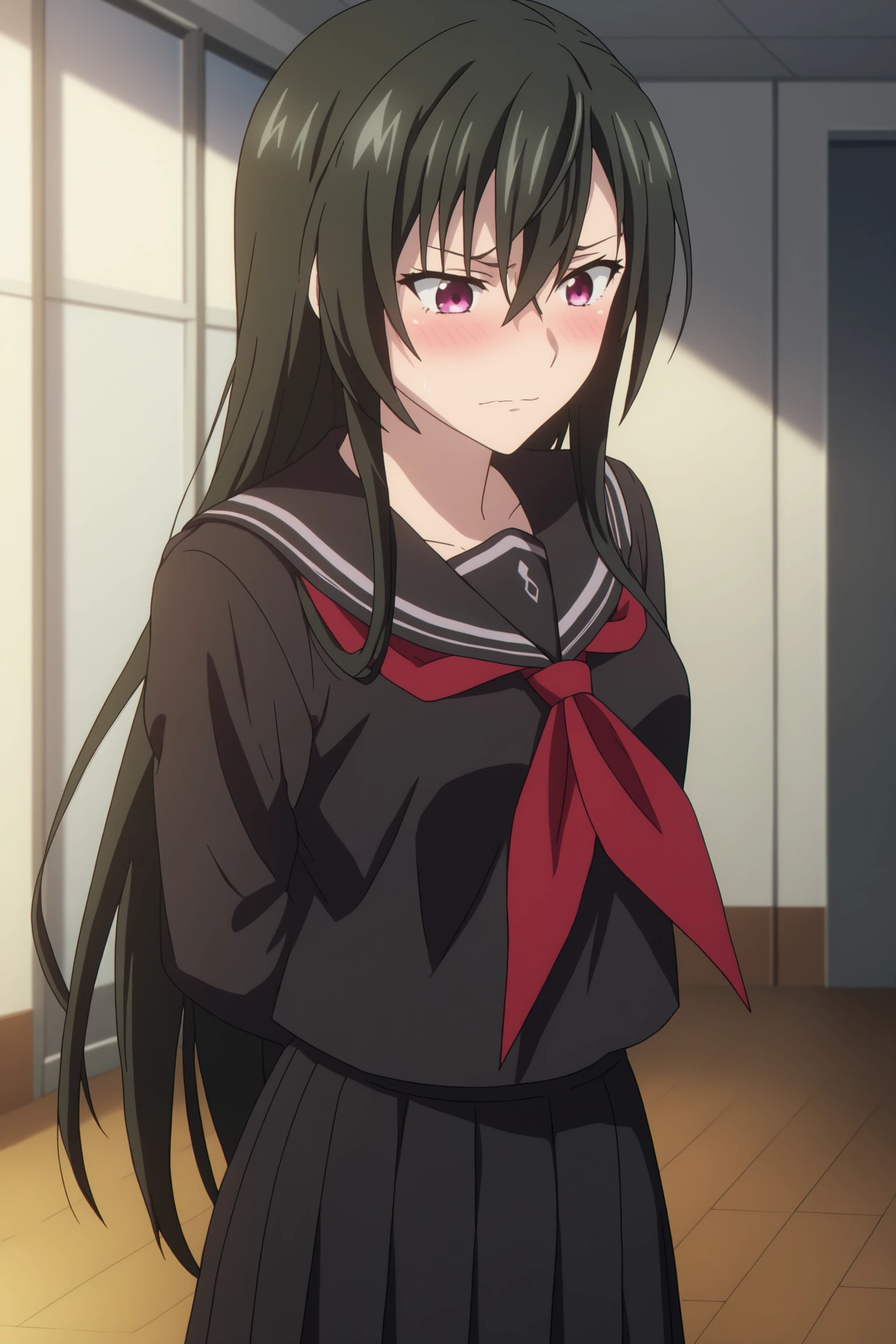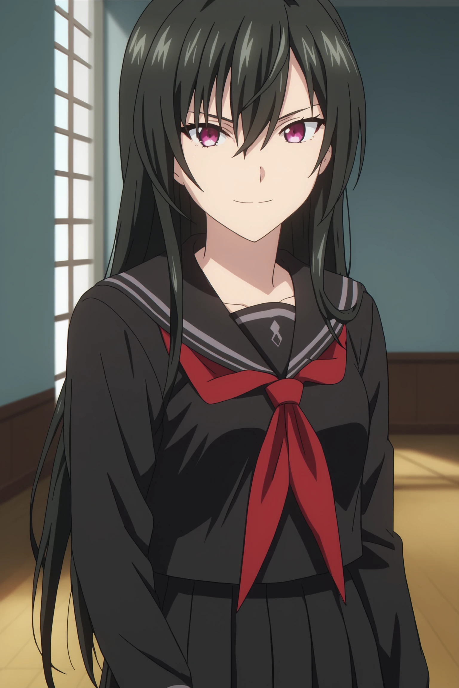 1girl, solo, long hair, bangs, black hair, hair between eyes, purple eyes, kiriha_kisaki