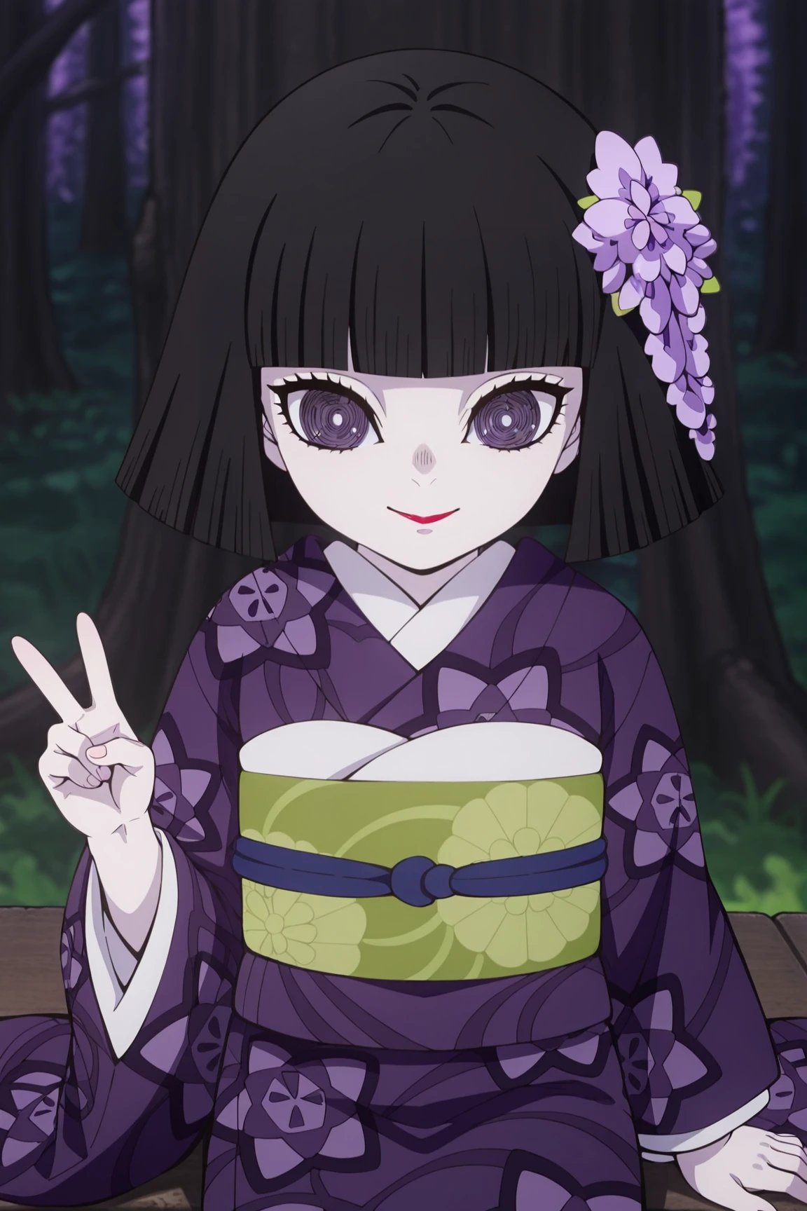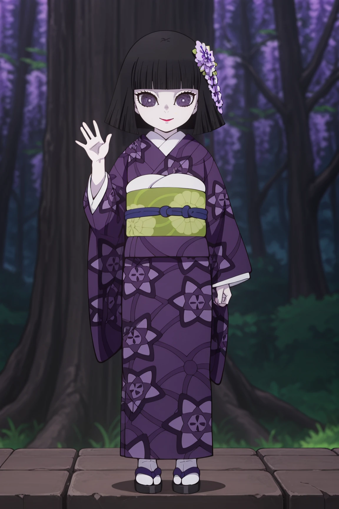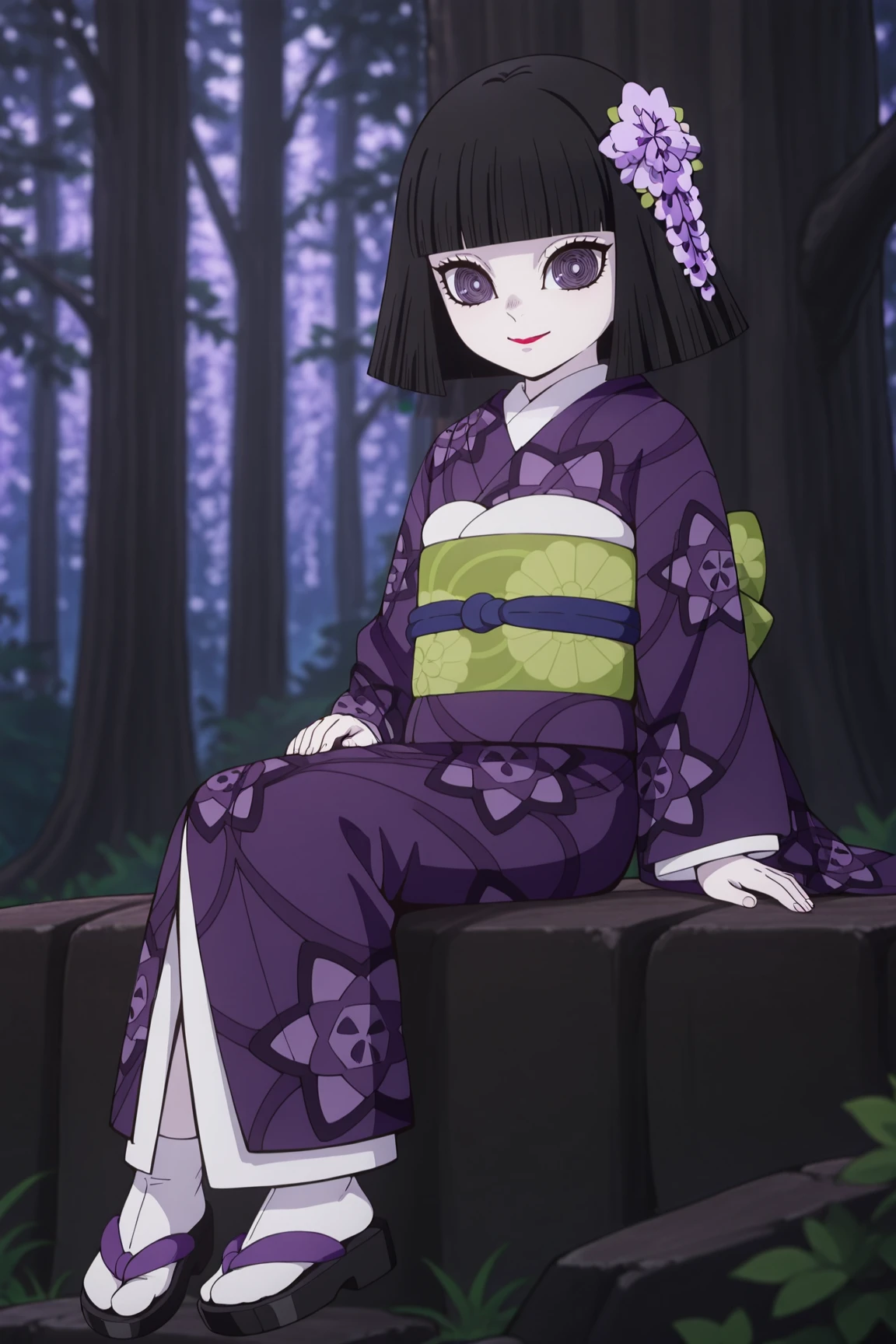 KiriyaUbuyashikiDSILXL, pale skin, black eyelashes, red lips, purple eyes, black hair, short hair, bob cut, blunt bangs, hair flower, purple flower, flat chest, japanese clothes, purple kimono, long kimono, long sleeves, green sash, blue obi