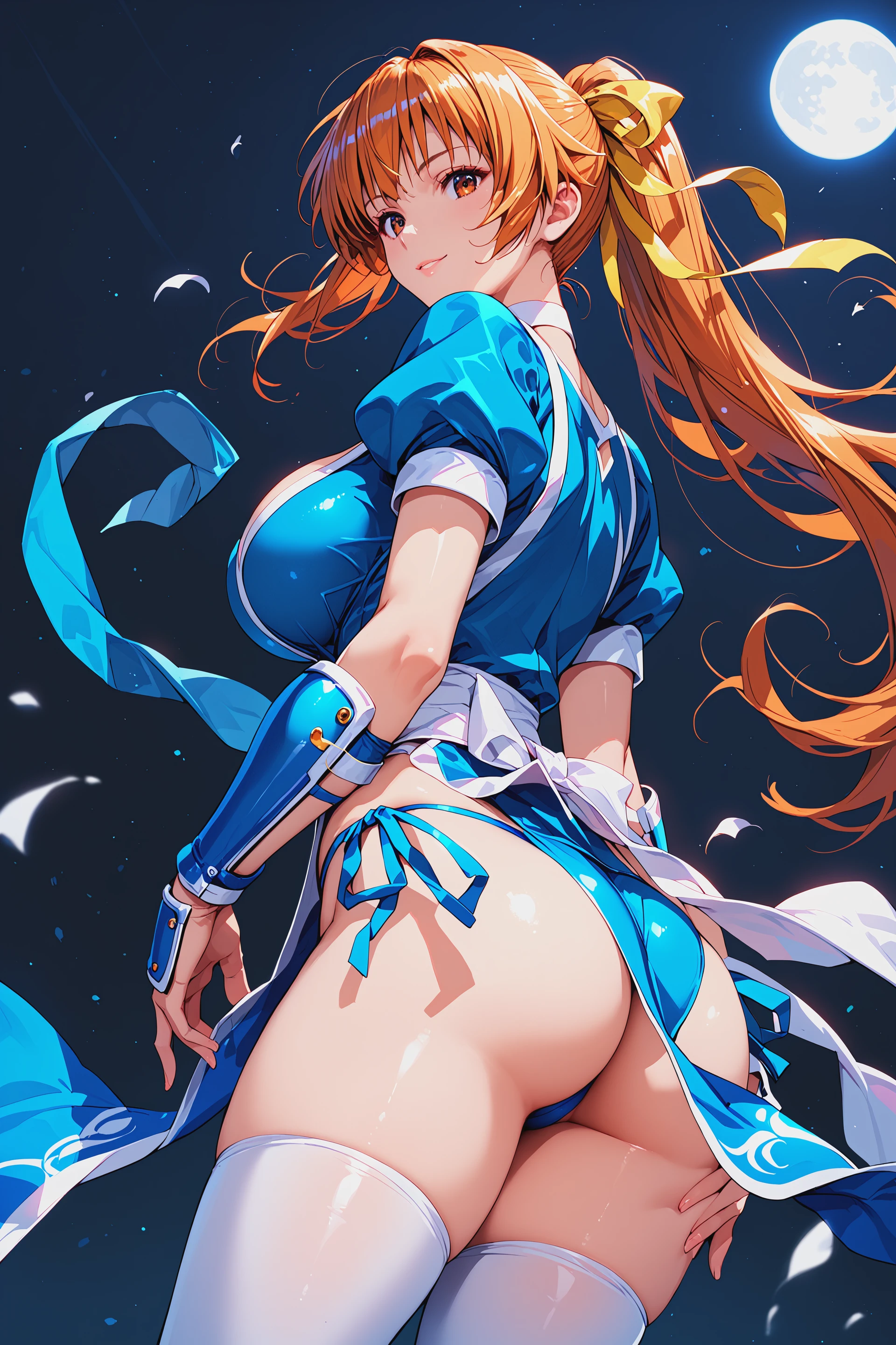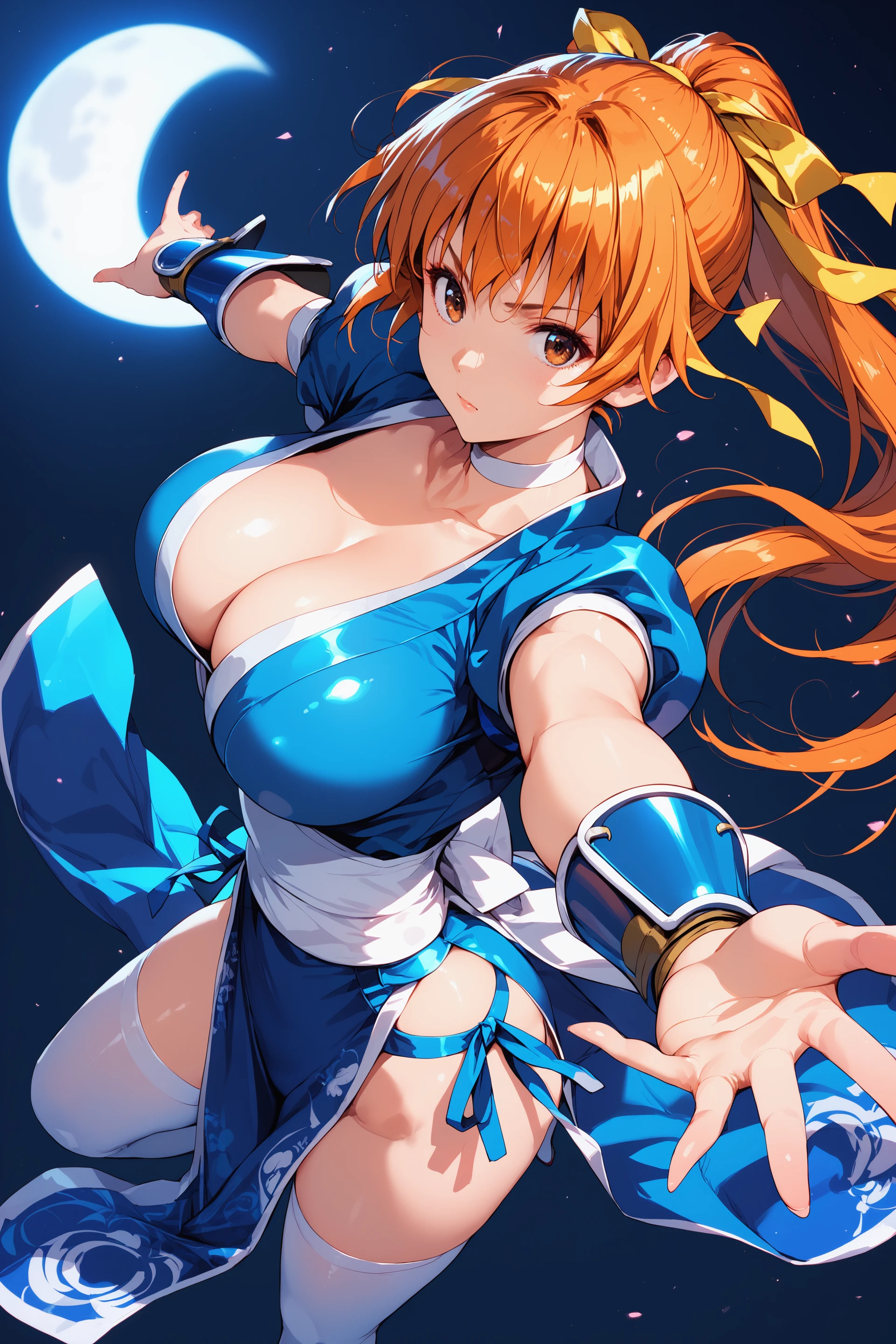 Trigger words: ceiiai kasumidoa, ponytail, bangs, orange hair, brown eyes, large breasts, blue outfit, choker, white choker, cleavage, blue pelvic curtain, blue straps, side tied straps, thighhighs, white thighhighs, short sleeves, arm guards, hair ribbon, puffy short sleeves, yellow ribbon, white sash, bare arms, blue sleeves, blue japanese clothes, footwear