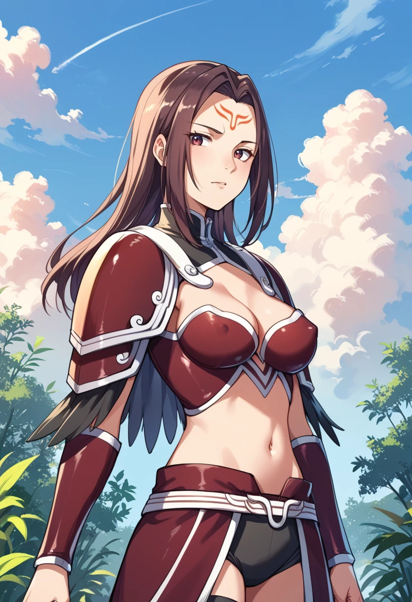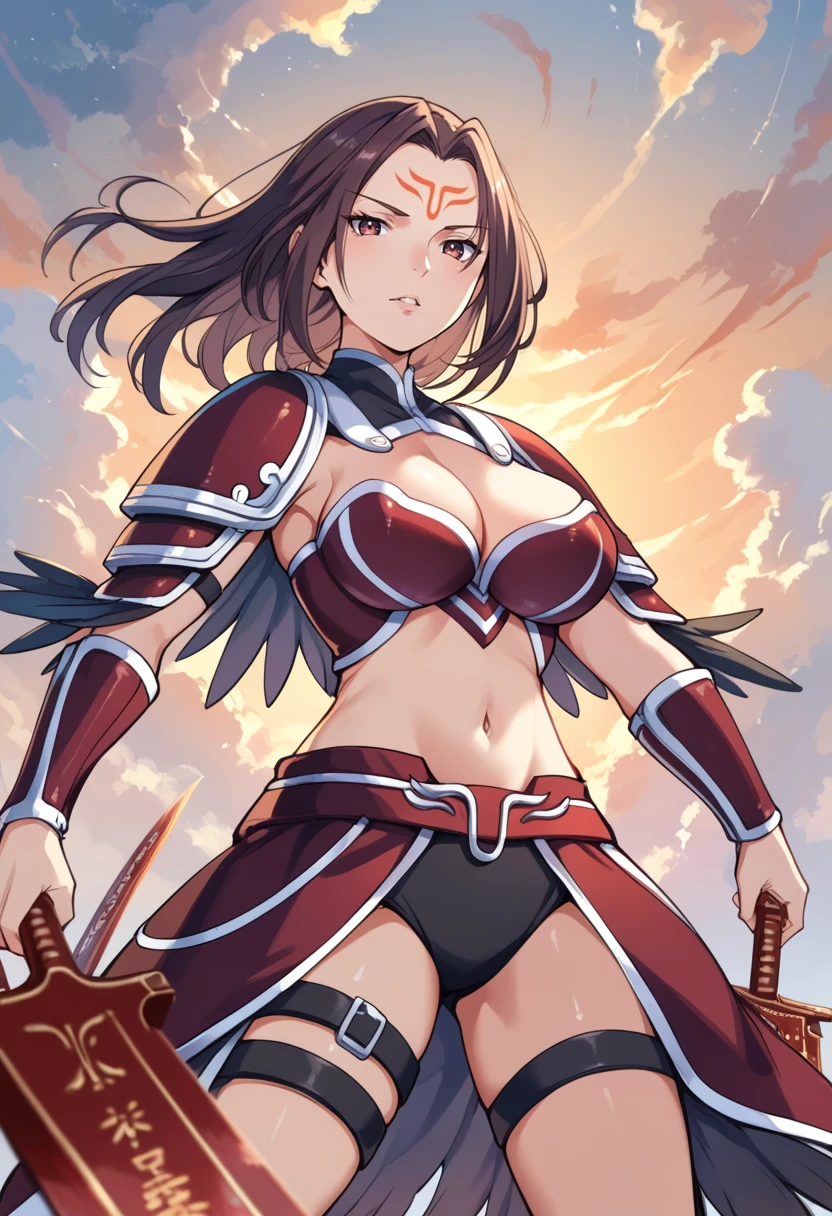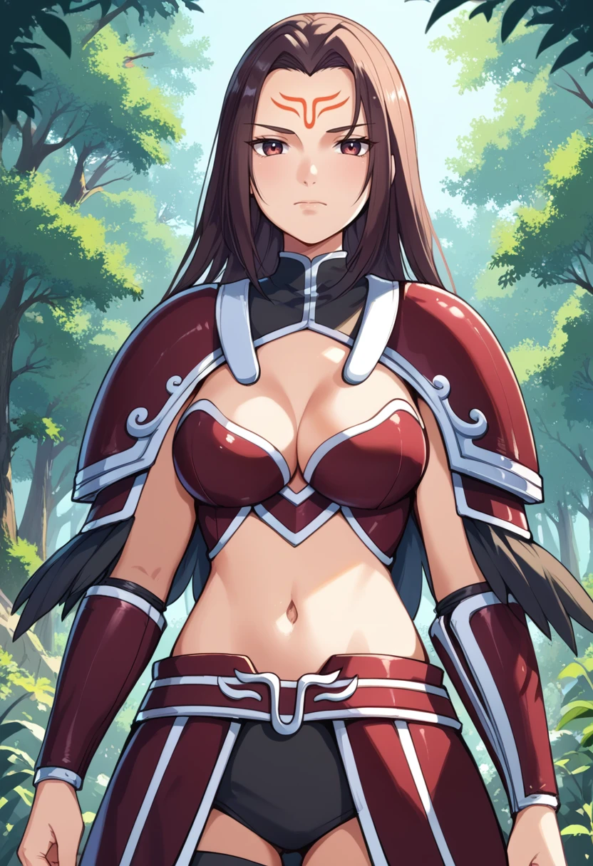 Tags (clothes): red bikini armor, red shoulder armor, red faulds, red vambraces, red armored boots, navel, midriff