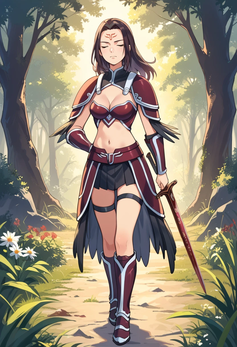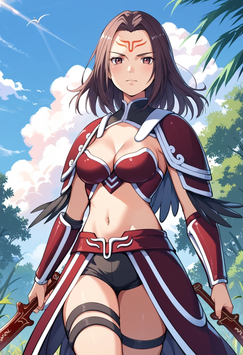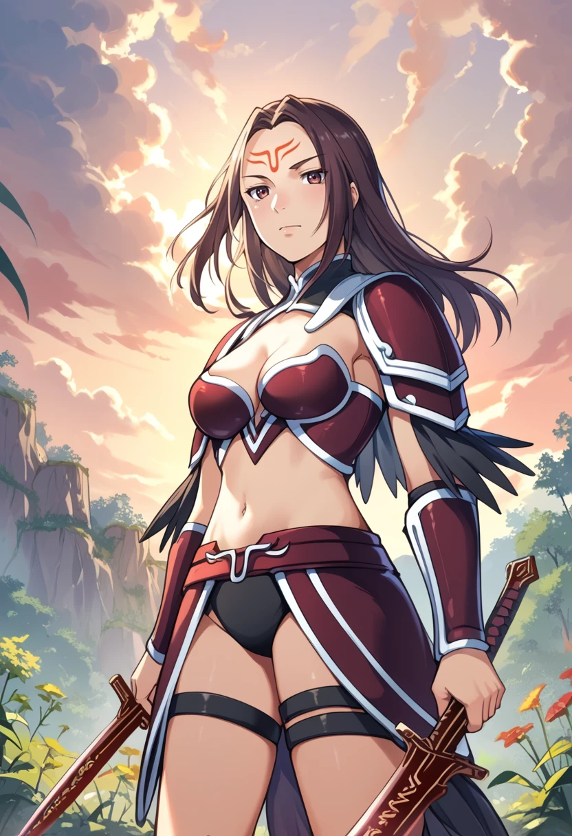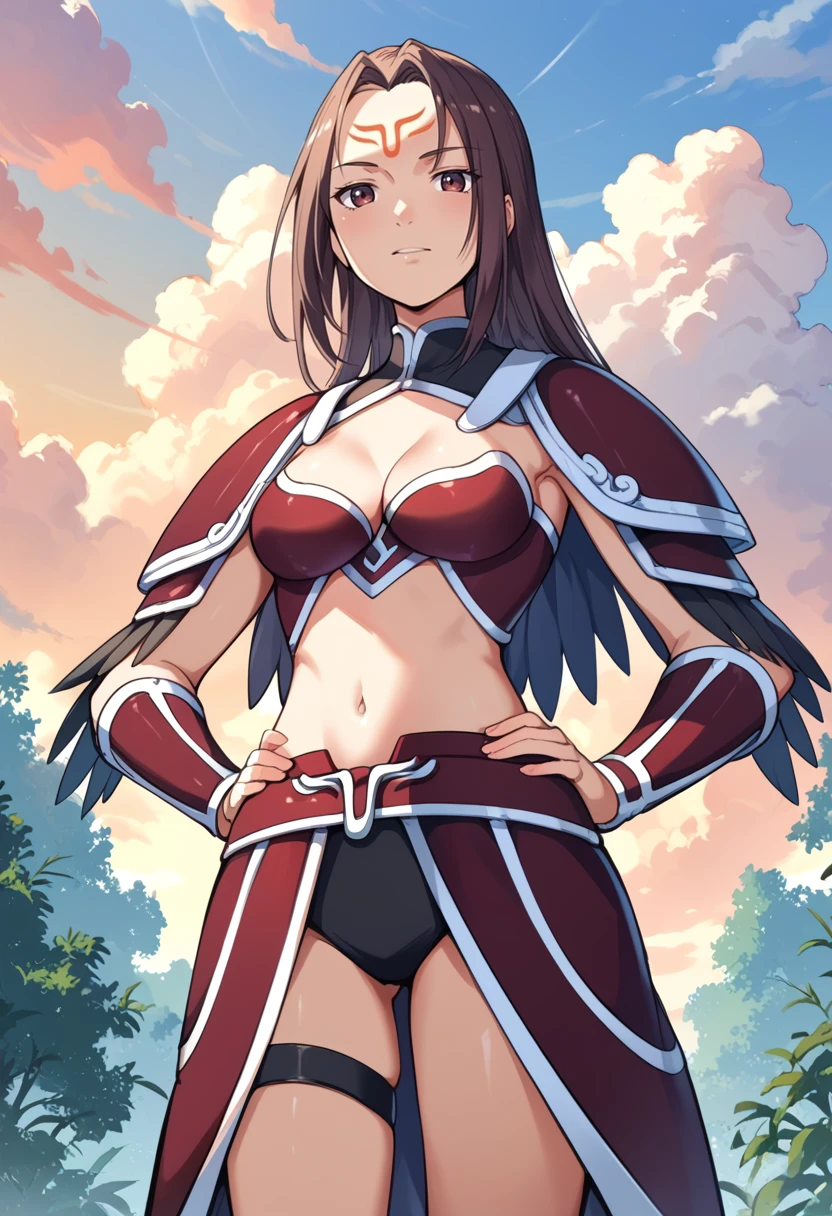 Tags (clothes): red bikini armor, red shoulder armor, red faulds, red vambraces, red armored boots, navel, midriff