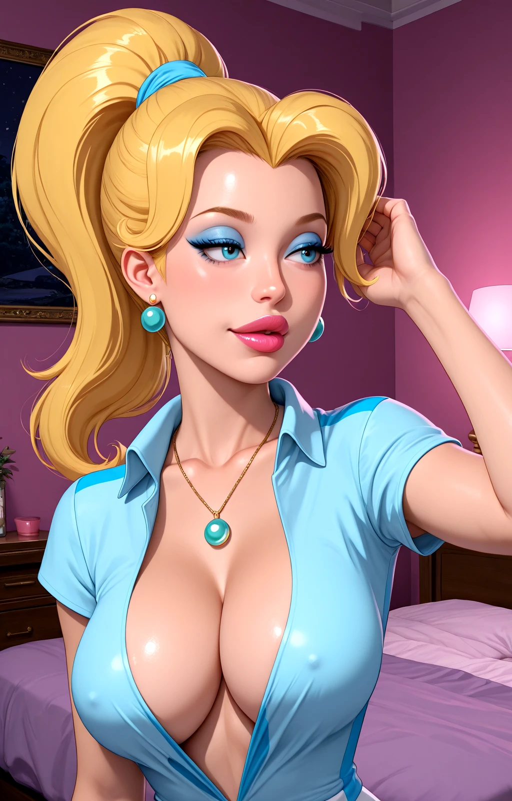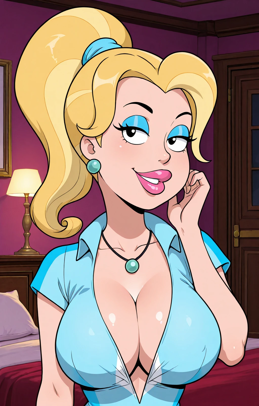 sexpun t'come, blonde hair, narrow waist, thick lips, toon (style), flat color, two-tone hair, ponytail, huge breasts,