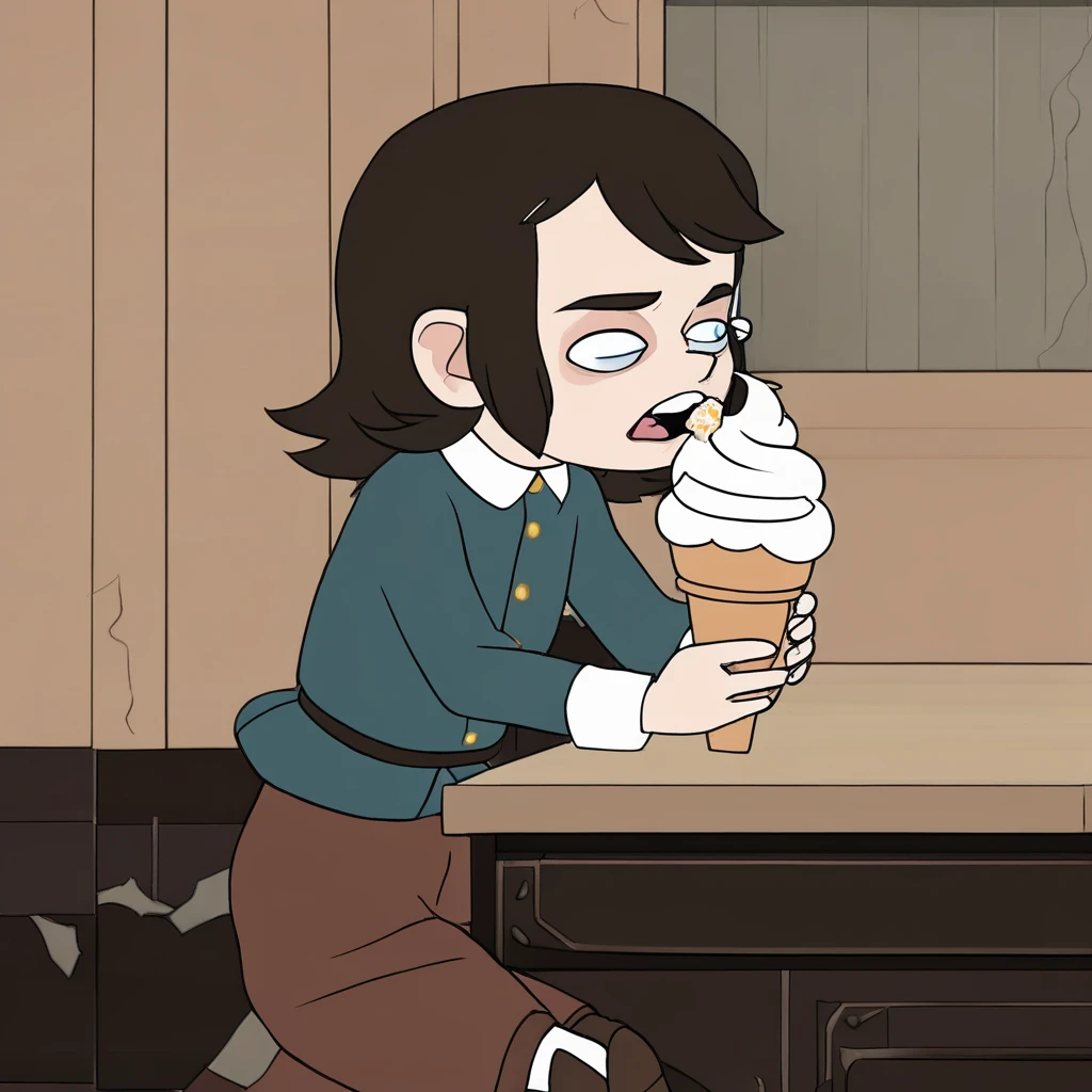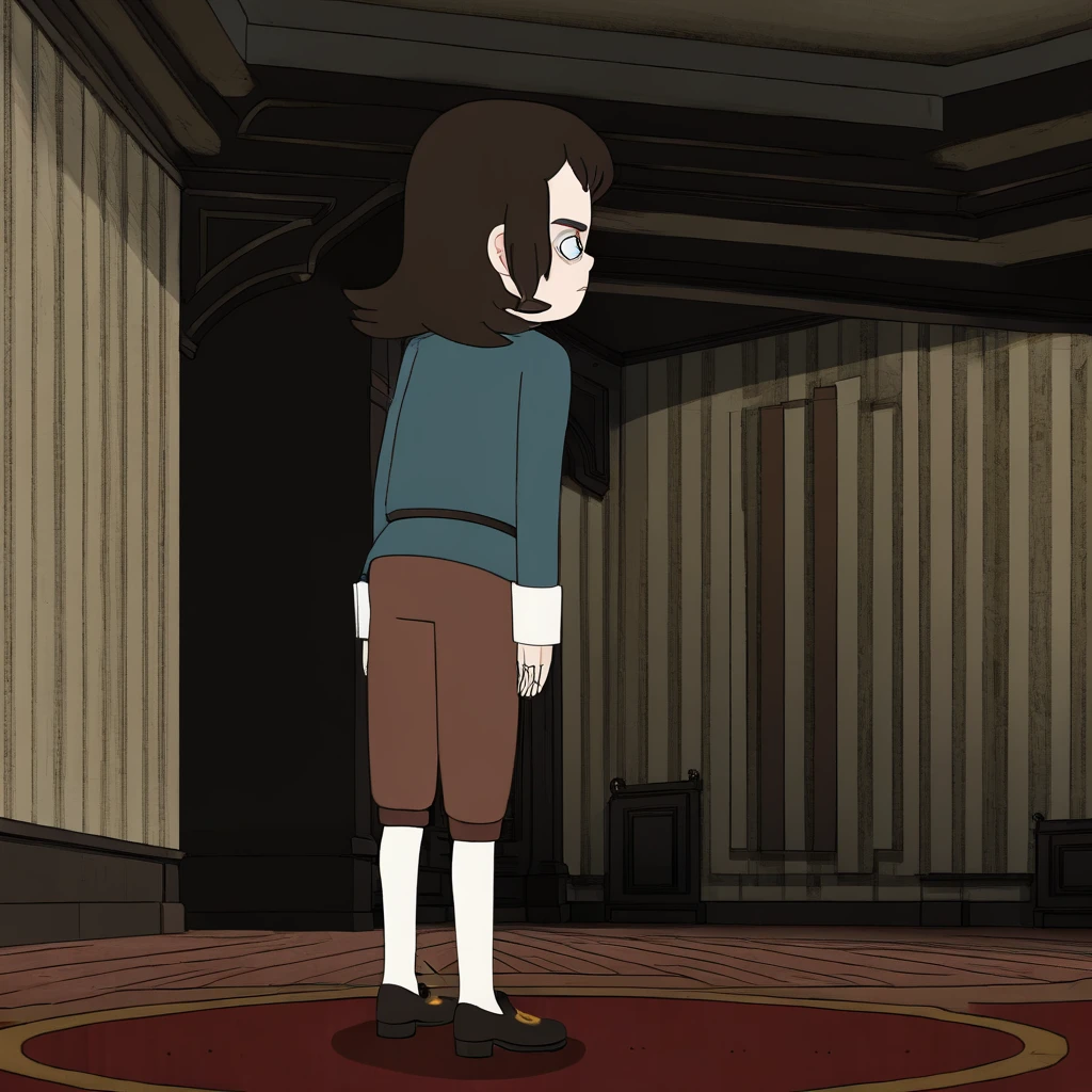 AbaddonCharacter, 1boy, solo, male child, Abaddon hair style, dark brown hair, fair skin, blue eyes, droopy eyelids, thin and short body, dark teal long-sleeve shirt, black belt, brown knee-length pants, white stockings, black shoes with gold buckles,