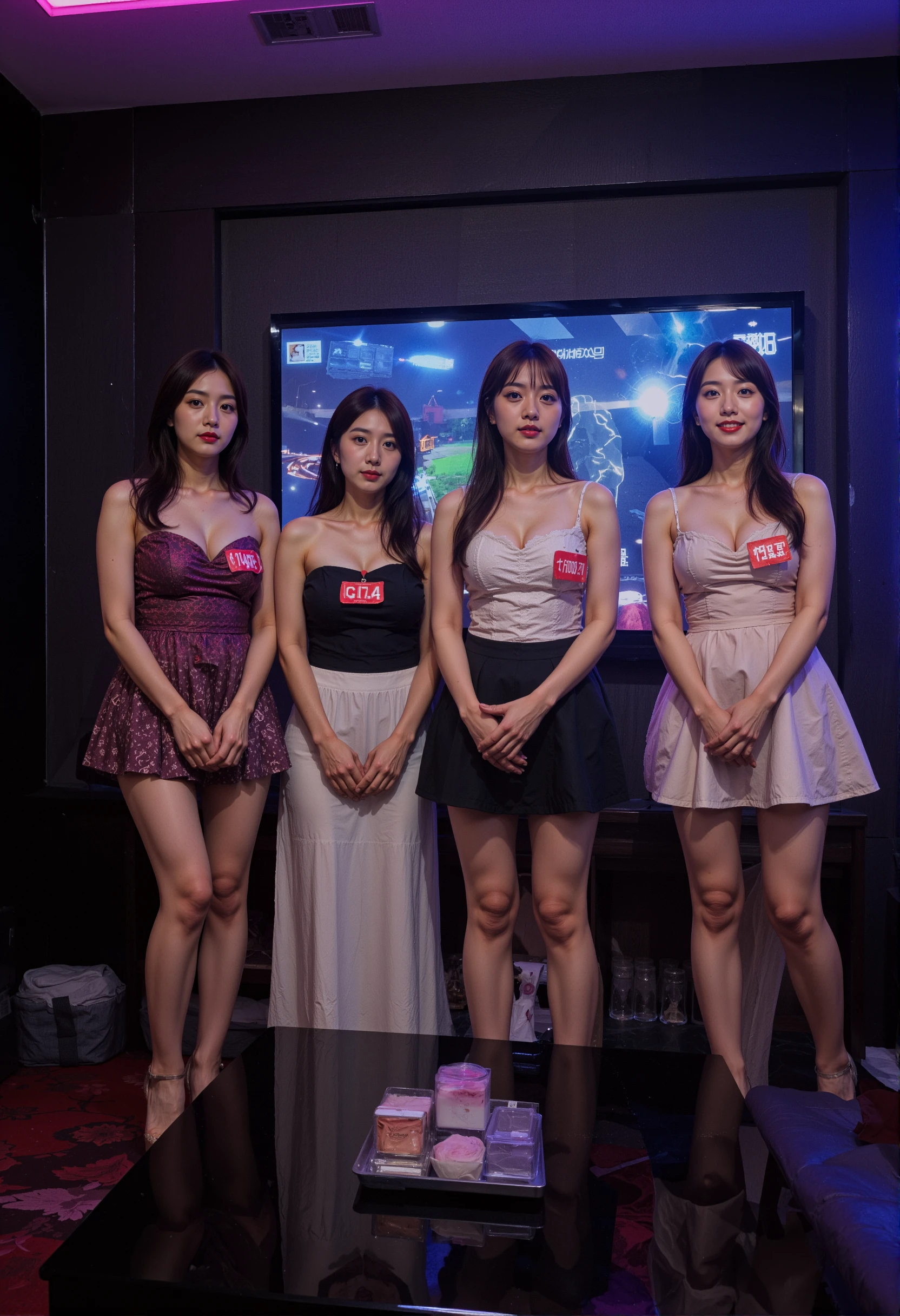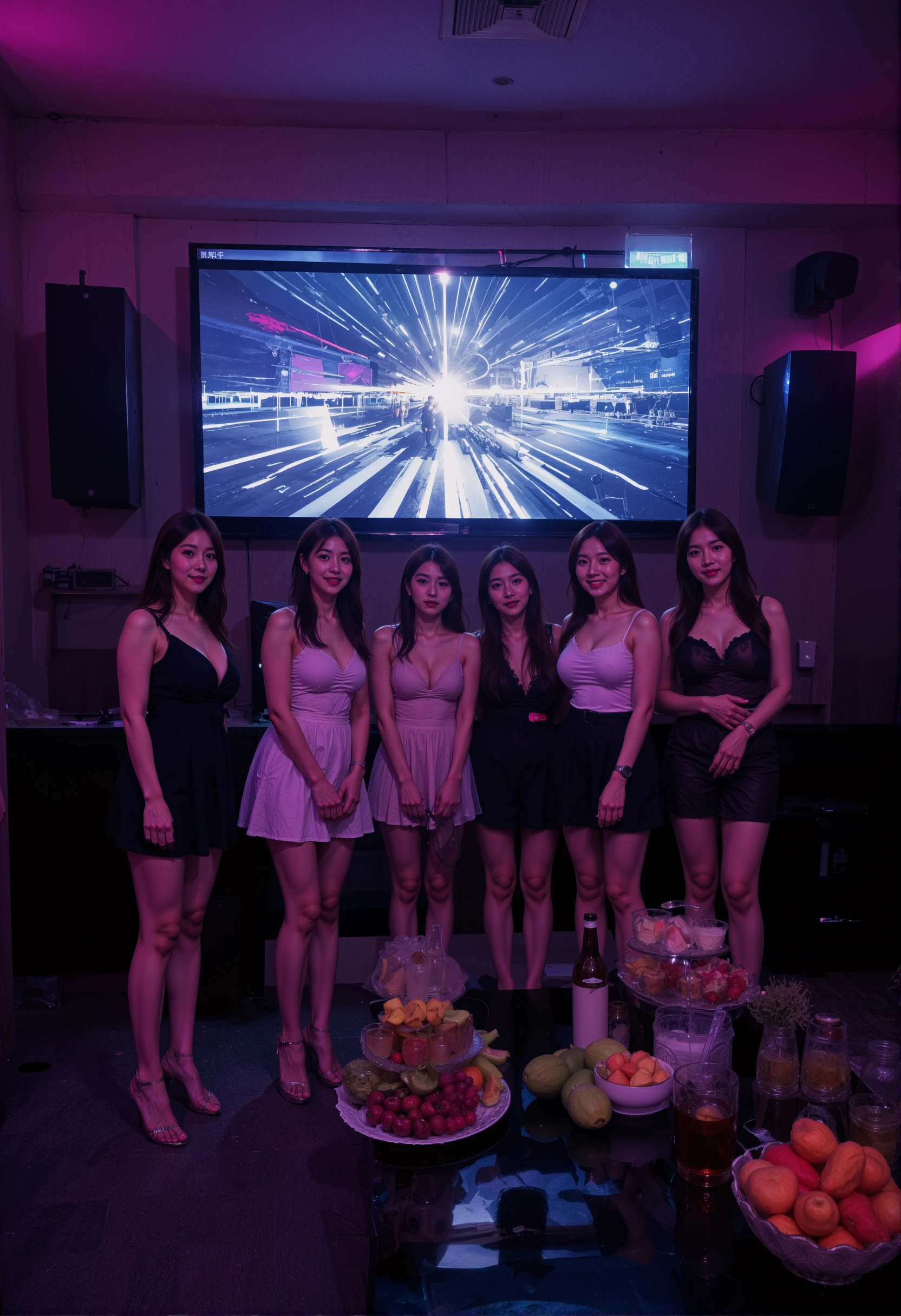 girls_in_ktv_room, 4+ women standing in a tight line within a KTV room,a large tv screen behind them, looking at viewer,girls in various dresses and hairstyle,open space,white marble coffee table with fruits and drinks,dimly lit,illuminated by a distinct pink and purple ambient light,,