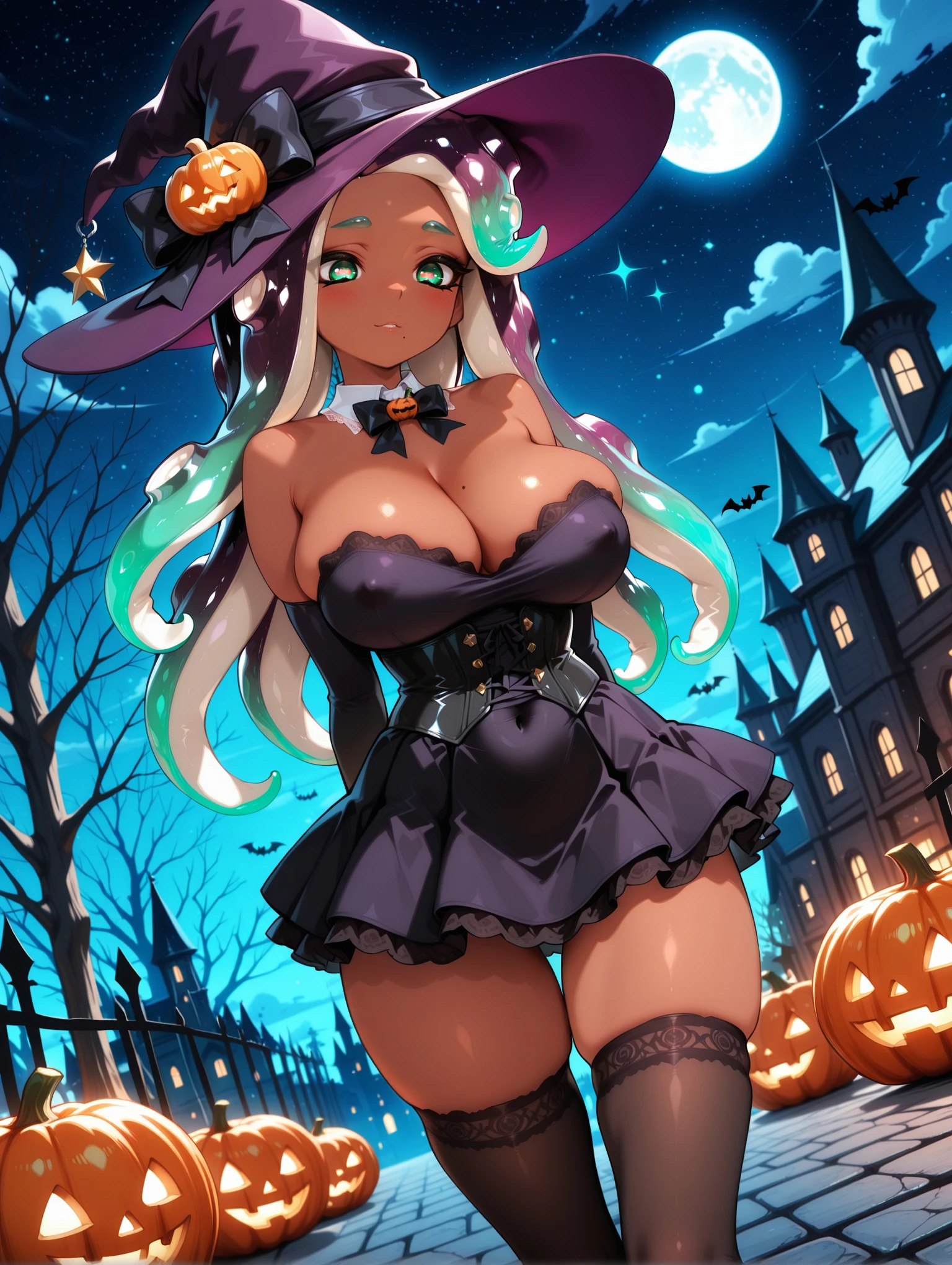 Marina Prompts : 1girl, dark skin, tentacle hair, long hair, multicolored hair, mole under mouth, suction cups, green eyes, pink pupils, large breast, navel piercing, green fingers, green hair, purple hair, black hair