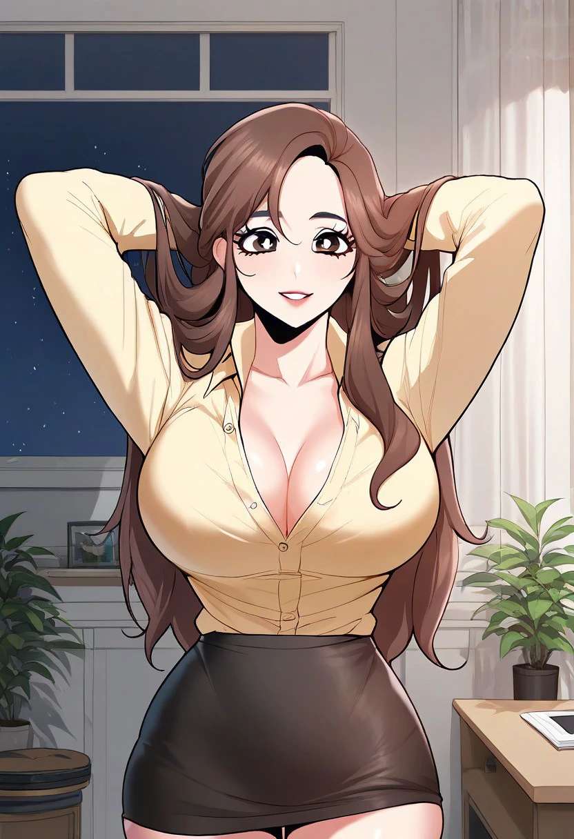10. ((beautiful long-sleeves yellow shirt, huge cleavage, obscene cleavage, black pencil skirt, ))