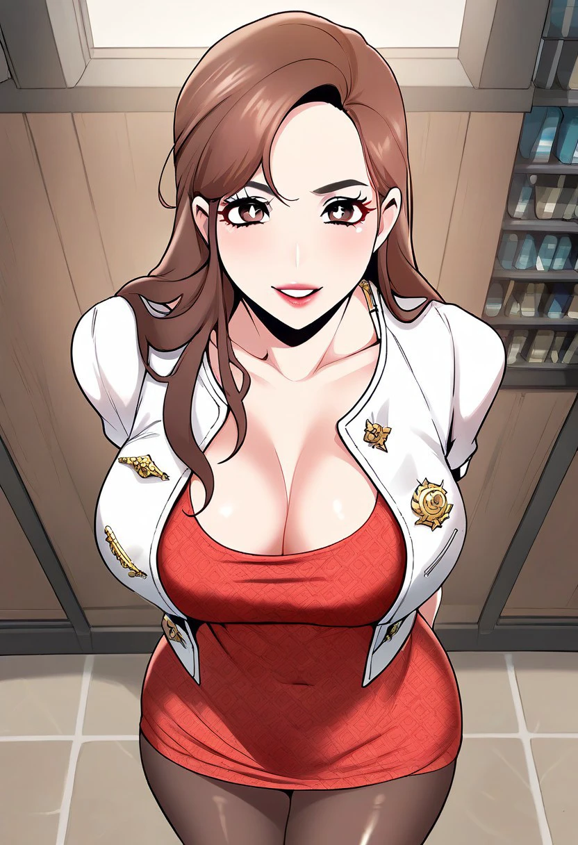 8. ((beautiful aestetic open short-sleeves white micro jacket, sexy beautiful cut-out red dress, huge cleavage, obscene cleavage, sexy sheer black pantyhose, )) + formal white high-heels, sexy ?????? black thong,