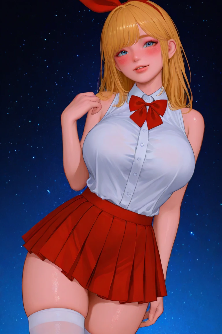 long hair, blonde hair, blue eyes, large breasts,white shirt, red skirt, hair bow, bowtie, pleated skirt, sleeveless shirt, zettai ryouiki, red bow, white thighhighs, sandals,Bikini: