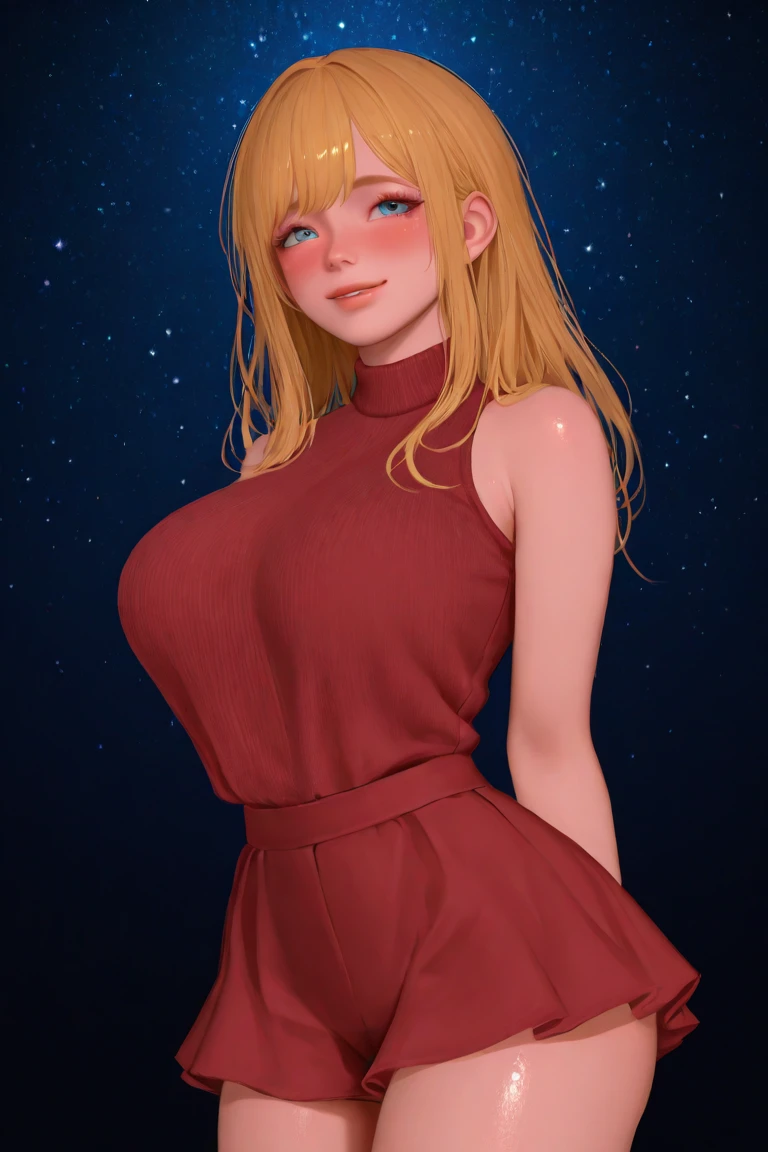 long hair, blonde hair, blue eyes, hair over shoulder, large breasts,pink dress, hair scrunchie, white socks, cleavage,Red Dress: