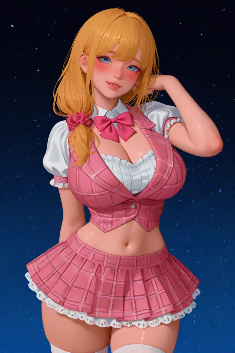 long hair, blonde hair, blue eyes, hair over shoulder, large breasts,navel, midriff, cleavage, scrunchie, crop top, clothing cutout, short sleeves, puffy short sleeves, pink vest, miniskirt, pleated skirt, pink skirt, zettai ryouiki, hair bow, pink bow, plaid, frills, white thighhighs, pink footwear,Ranch: