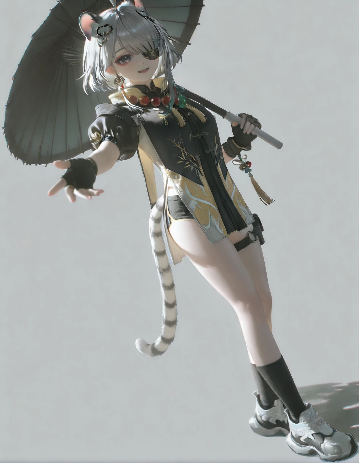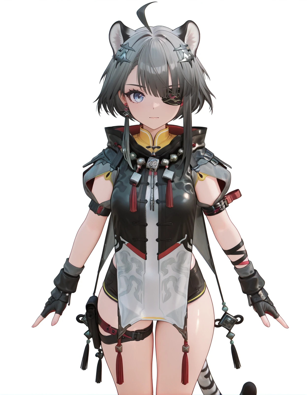 tangtang,1girl,ahoge,grey hair,swept bangs,asymmetrical hair,short hair with long locks,low ponytail,grey eyes,eyepatch,tiger ears,tiger tail,hair ornament,single tassel earrings,bead necklace,yellow high collar,black shawl,white microdress,puffy short sleeves,arm belt,black gloves,fingerless gloves,black shorts,thigh holster,black kneehighs,sneakers,