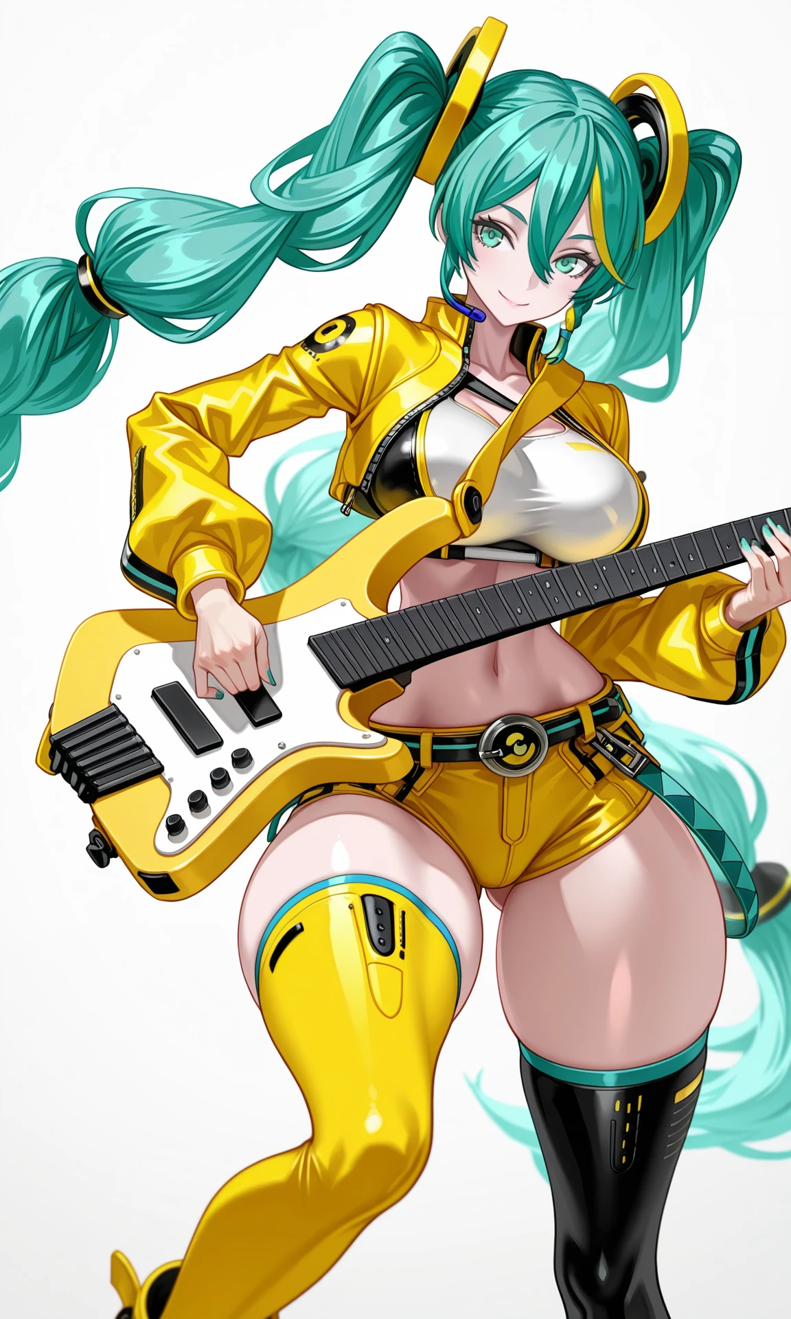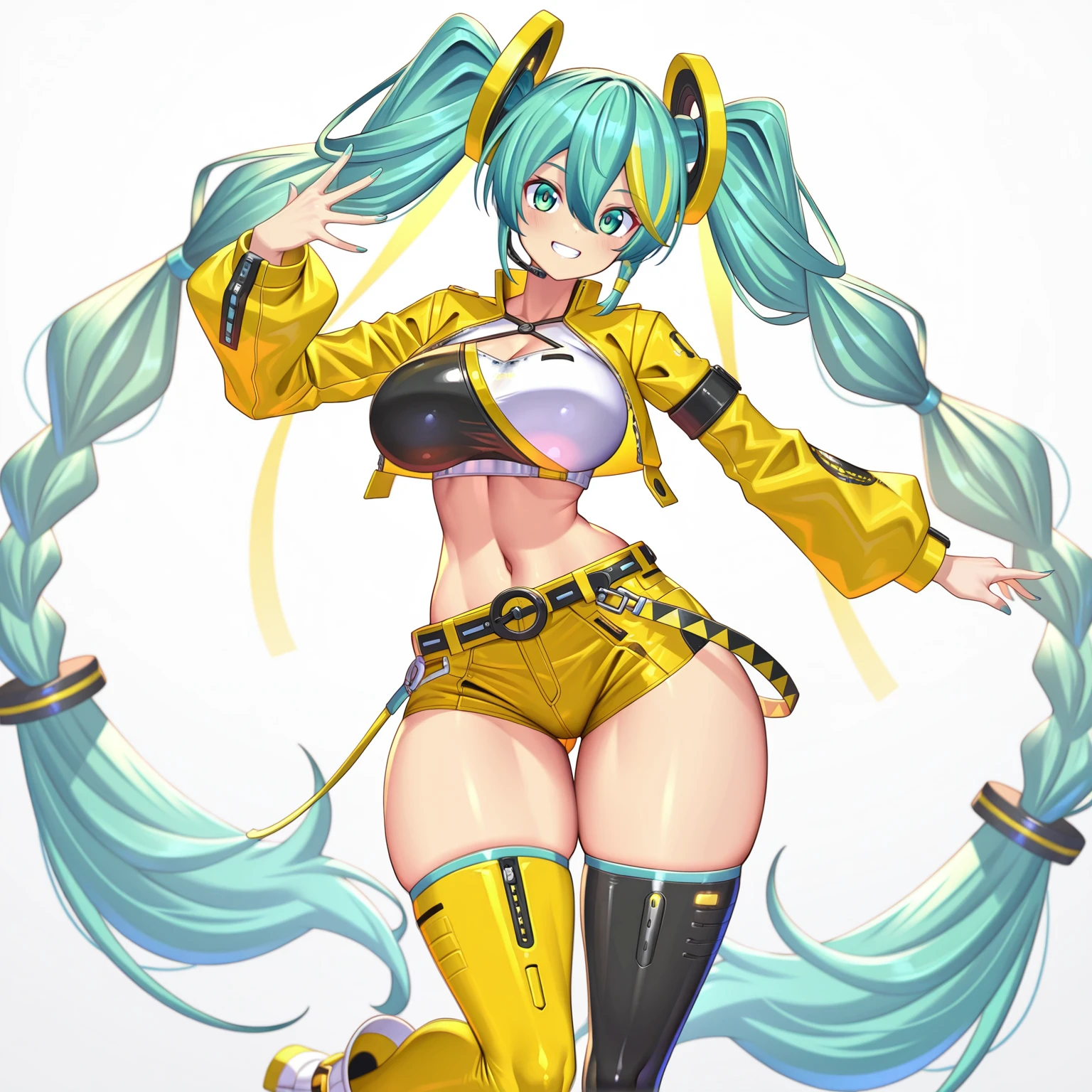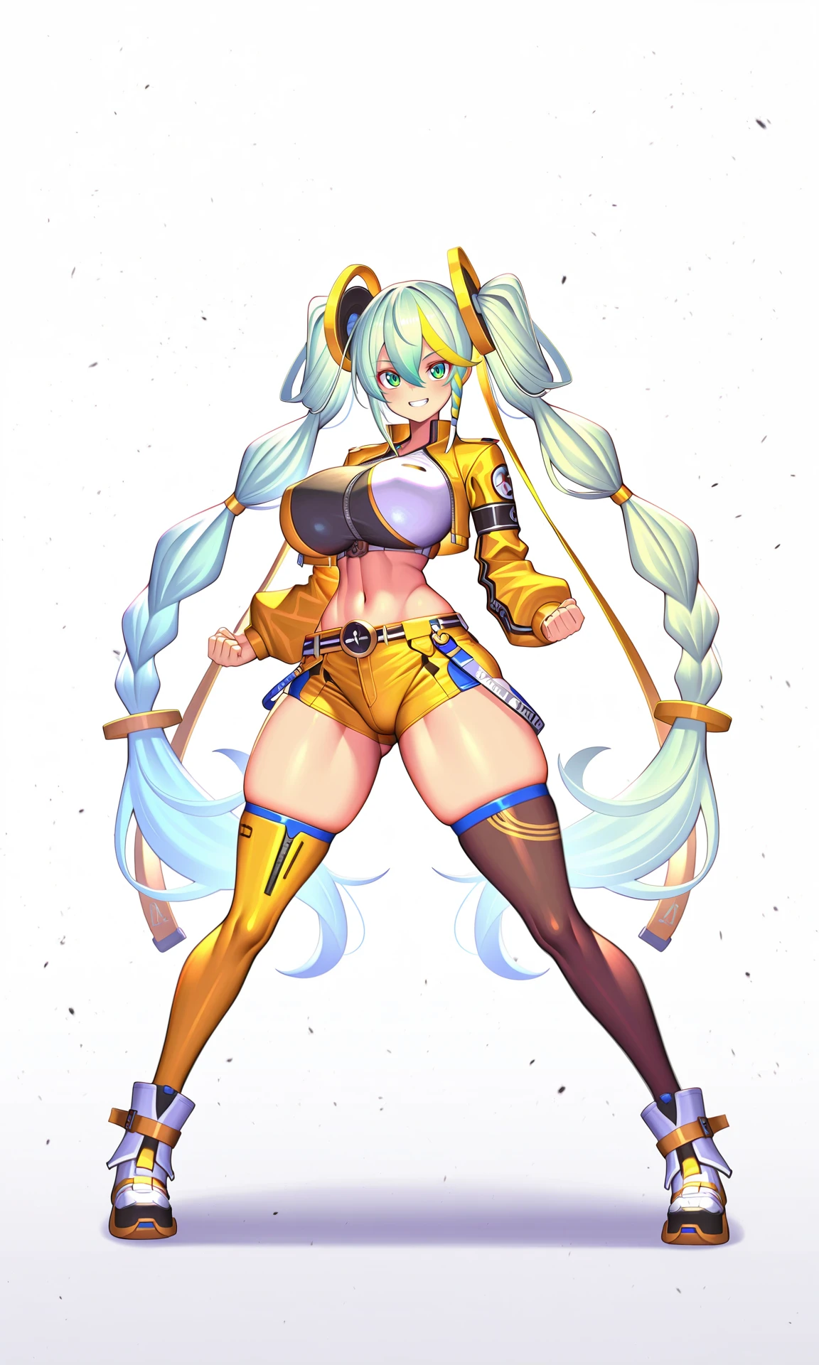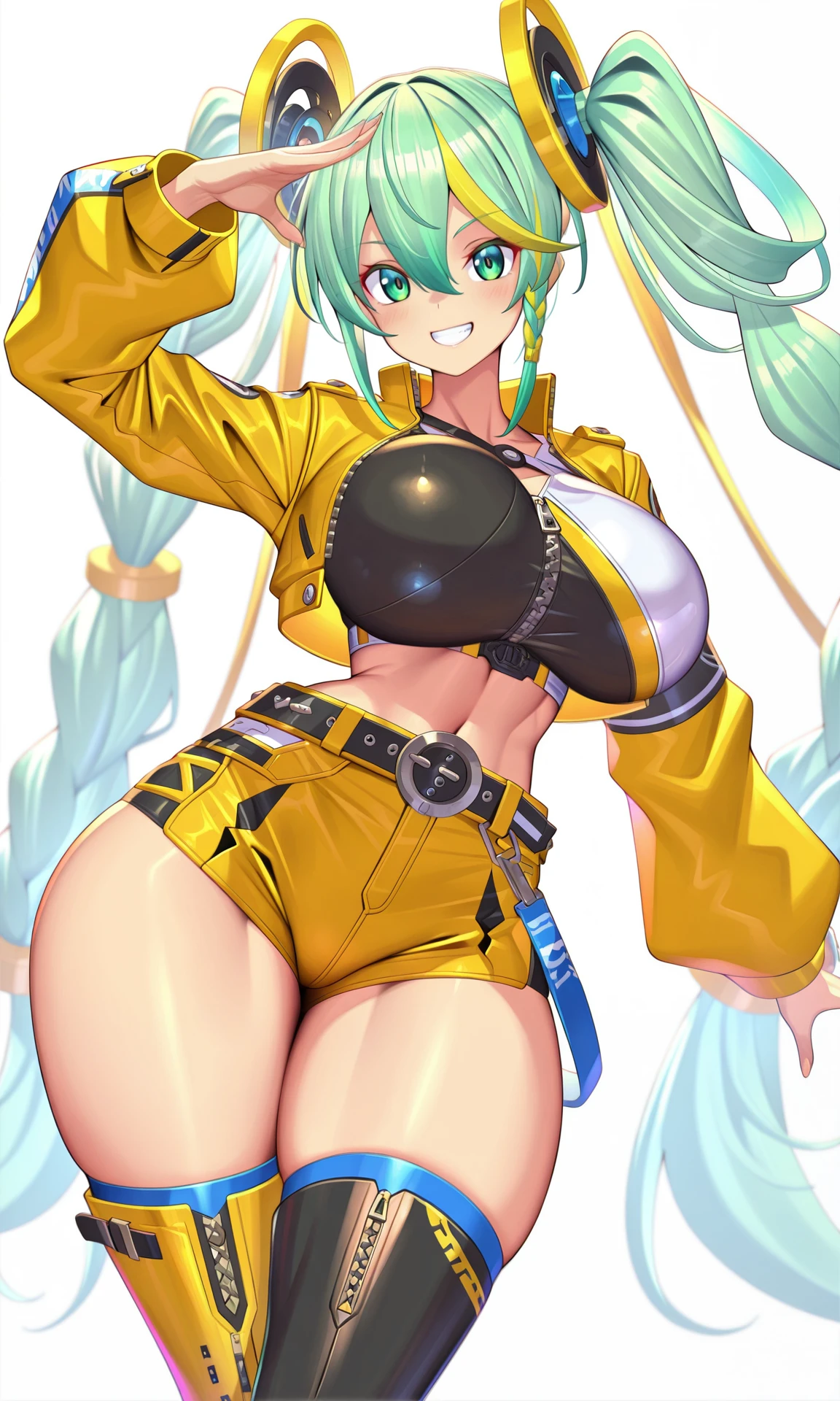 long hair, twintails, very long hair, green_hair, green_eyes, hair_ornament, braided_twintails,hair_rings,streaked_hair ,yellow_hair,hair_between_eyes, braided_sidelock, cropped_vest,cropped_jacket, long_sleeves, yellow_jacket,