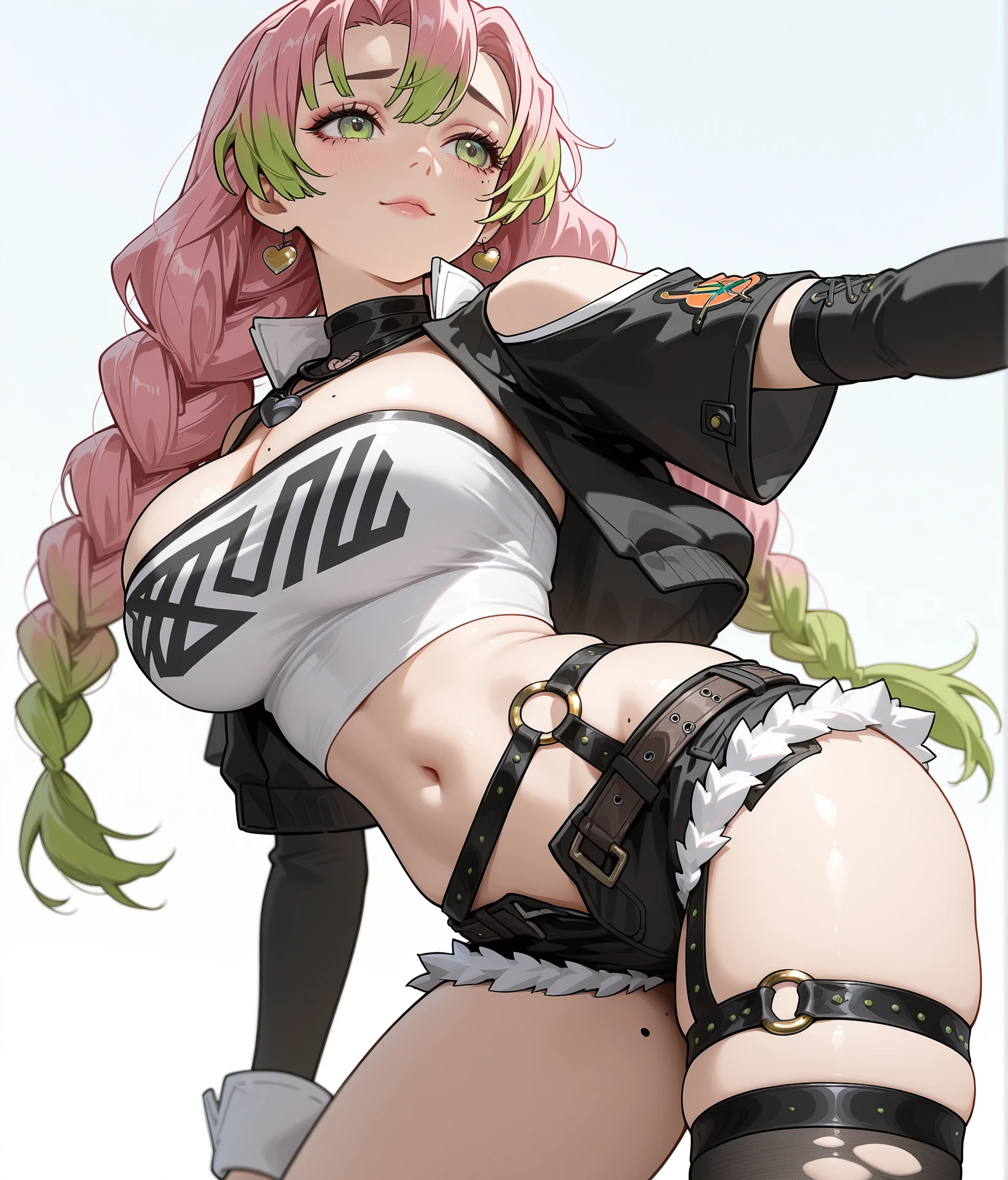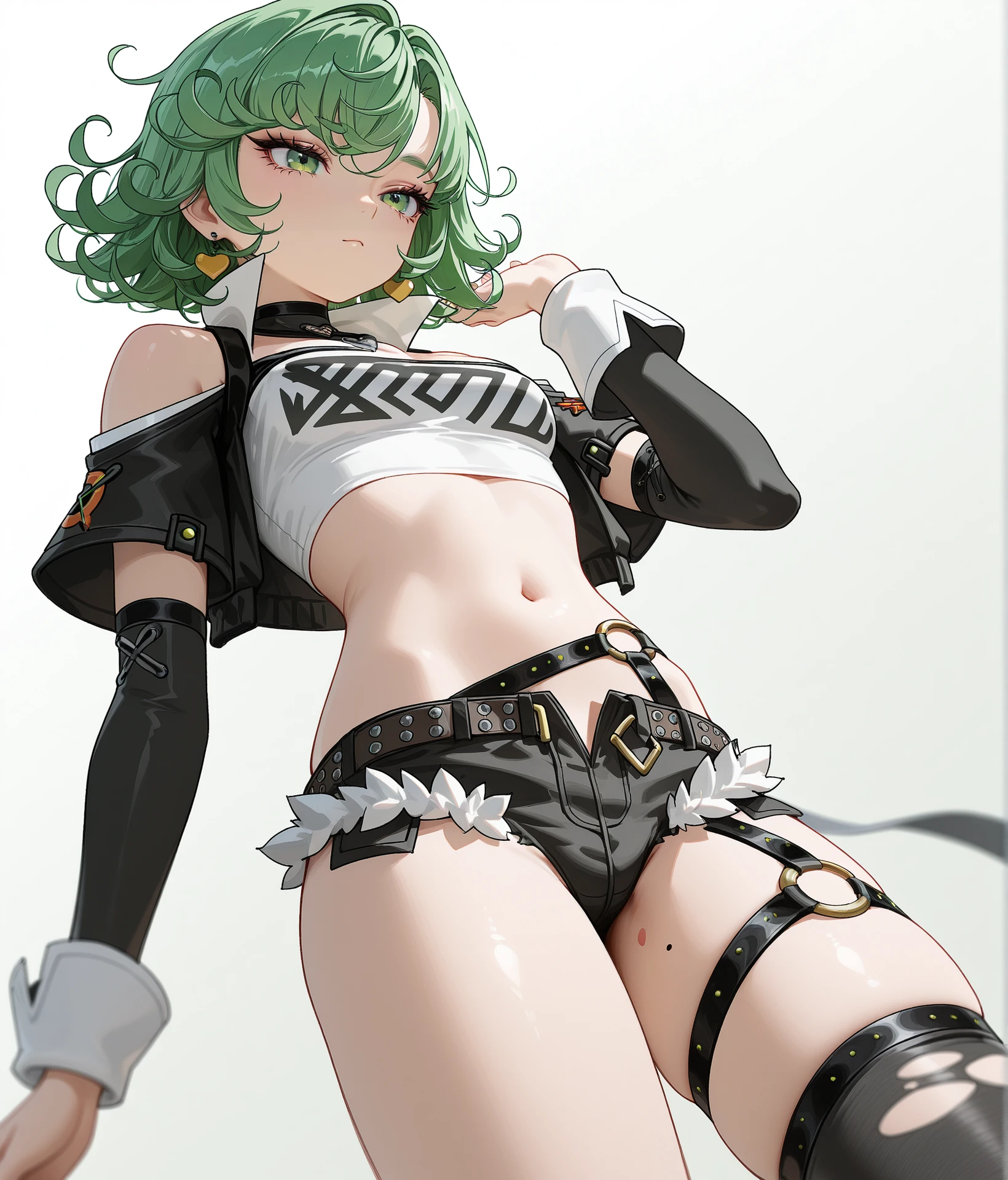 thighhighs, jacket, thighs, shorts, belt, black thighhighs, short shorts, strapless, thigh strap, black shorts, single thighhigh, o-ring, open fly, torn thighhighs, cutoffs, heart earrings, micro shorts,