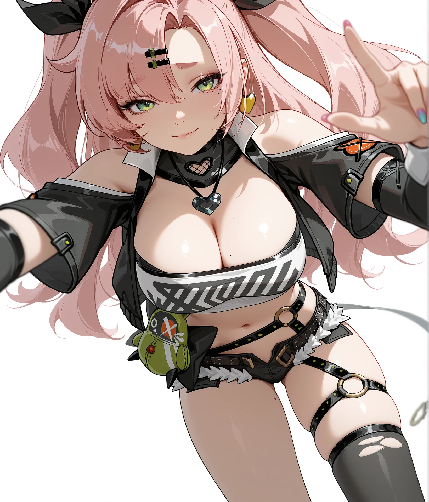 eyelashes, nose, long hair, bangs, hair ornament, ribbon, hair between eyes, very long hair, green eyes, hair ribbon, pink hair, hairclip, nail polish, two side up, mole under eye, mole, black ribbon, pink nails, mole on breast, multicolored nails, mole on thigh,