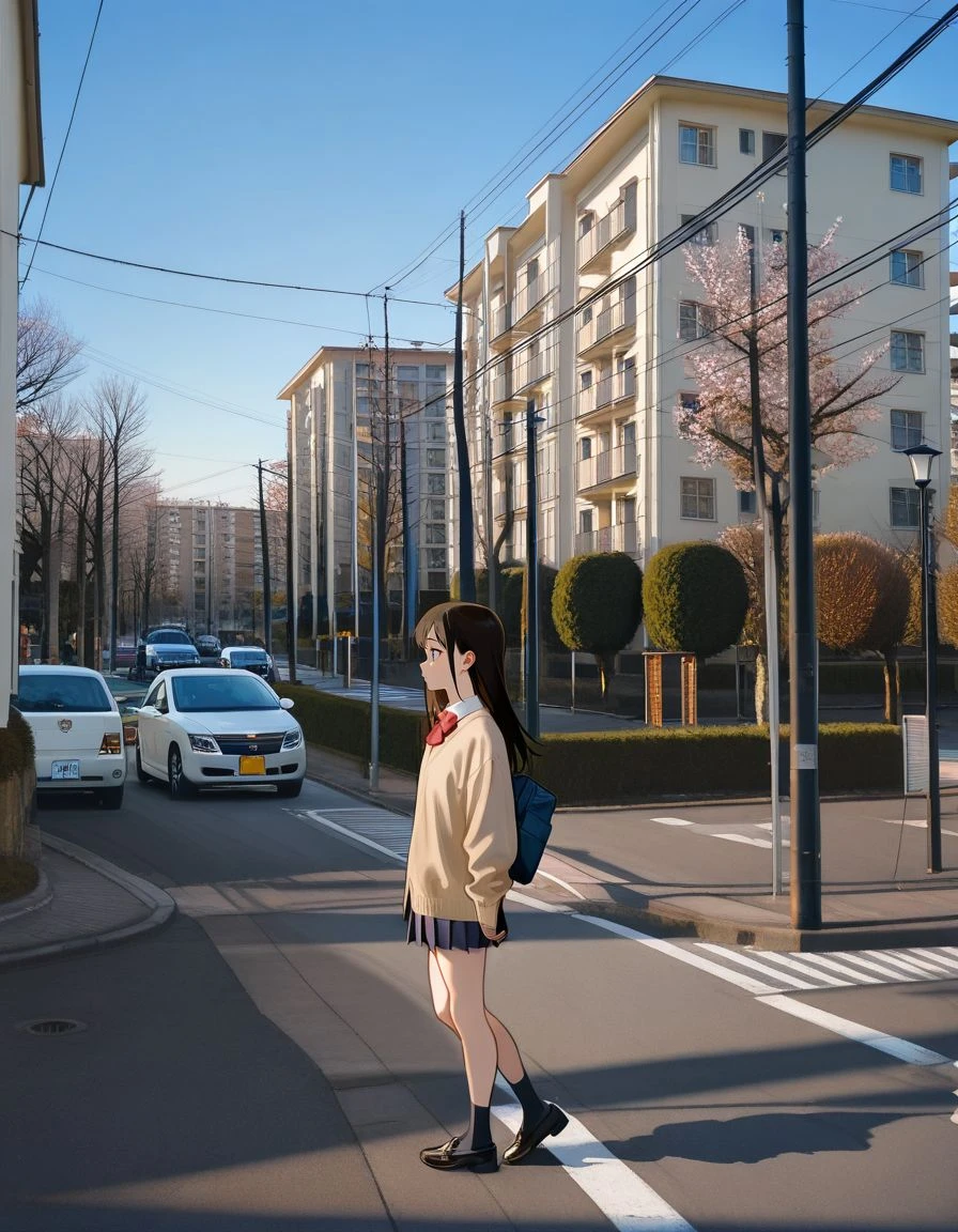 outdoors, scenery, building, lamppost, tree, bare tree, cherry blossoms, grass, entrance, car, parking lot, bicycle parking, path, street, road, stairs, utility pole, power lines, fence, chain-link fence, sign, road sign, traffic mirror,