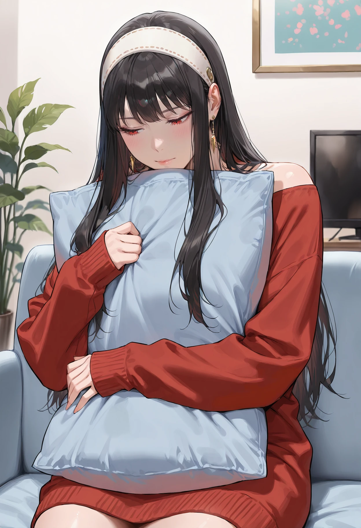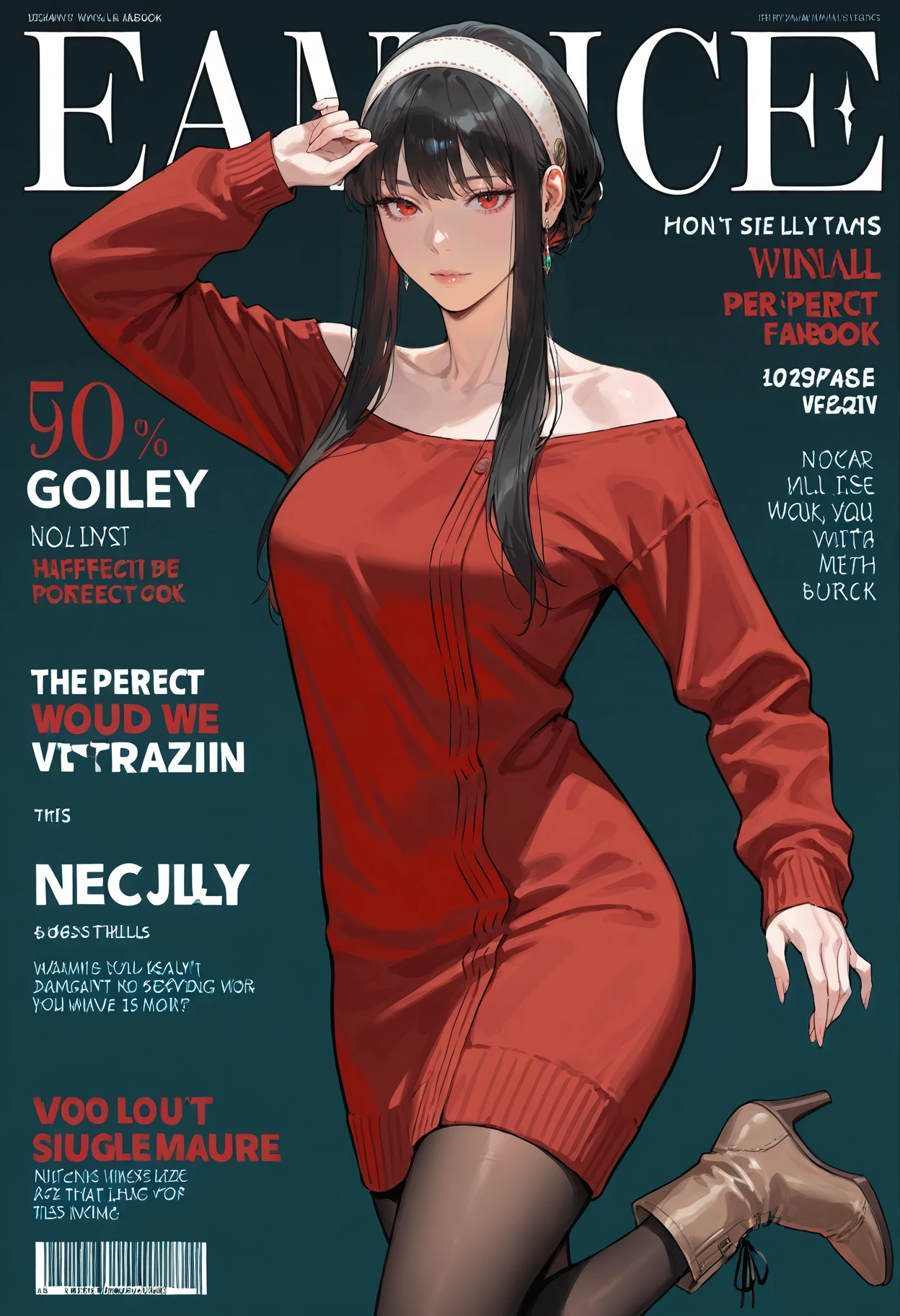 Outfit: white hairband, breasts,medium breasts,jewelry,earrings,off shoulder,bare shoulders,off-shoulder dress,sweater,off-shoulder sweater,red sweater,dress,red dress,sweater dress,long sleeves,pantyhose,black pantyhose,boots,high heel boots,high heels,brown footwear,ankle boots