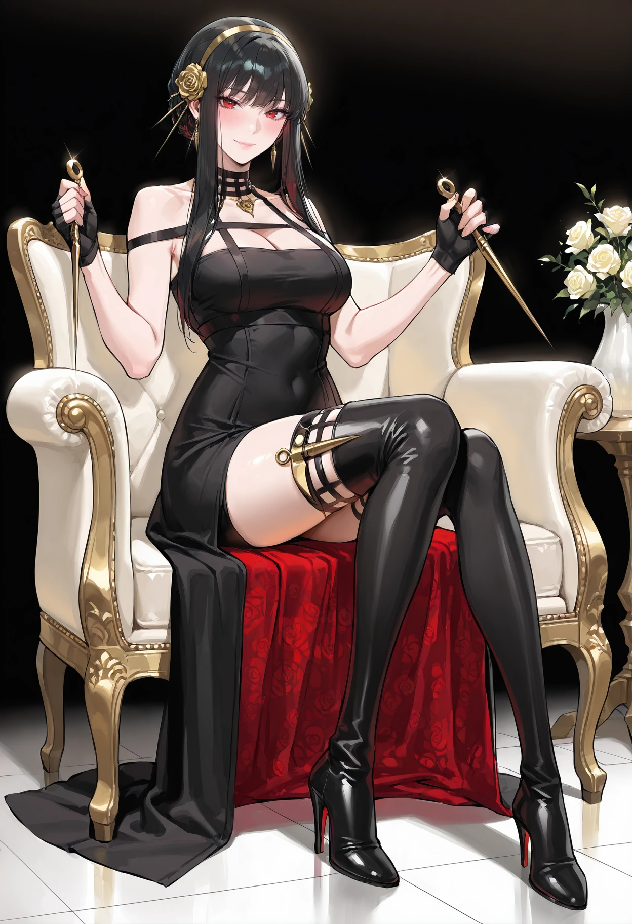 Alternative Outfit: gold hairband,yellow hairband,hair flower,hair ornament,jewelry,earrings,gold earrings,breasts,medium breasts,bare shoulders,gloves,fingerless gloves,black gloves,dress,sleeveless,sleeveless dress,black dress,two-sided fabric,two-sided dress,zettai ryouiki,thighhighs,black thighhighs,thigh boots,boots,high heel boots,high heels,black footwear