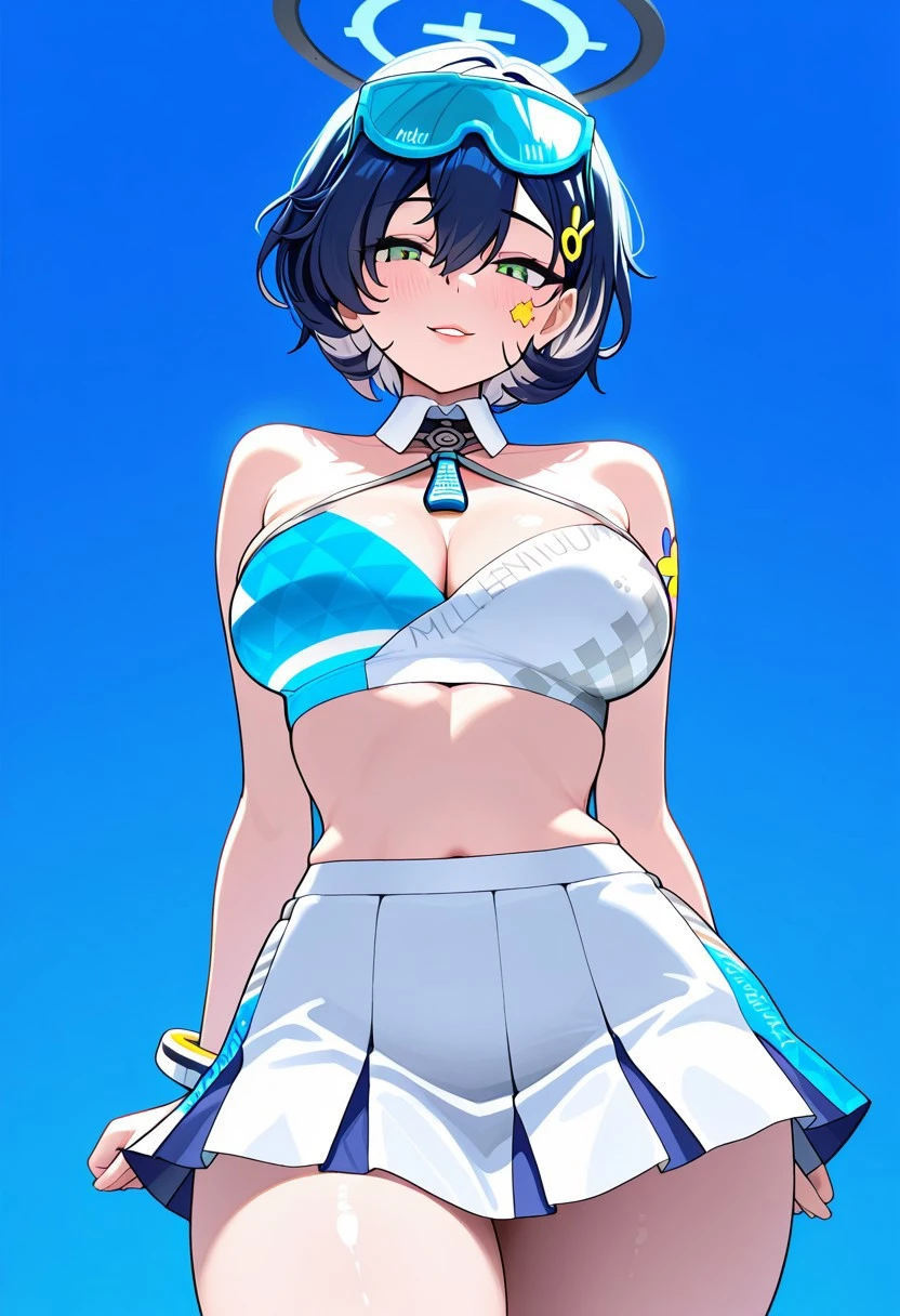 ChhrChrLdr,green eyes,blue hair,short hair,hair between eyes,halo,eyewear on head,goggles on head,tinted eyewear,bunny hair ornament,large breasts,millennium cheerleader outfit (blue archive),cheerleader,white skirt,pleated skirt,miniskirt,sticker on face,white footwear,sneakers,pom pom (cheerleading),Dress: