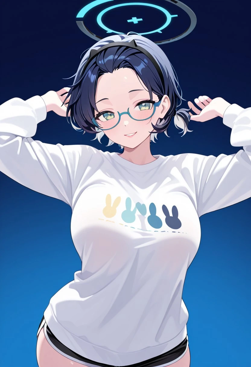 green eyes,blue hair,short hair,hair between eyes,halo,glasses,blue-framed eyewear,bunny hair ornament,large breasts,Default: