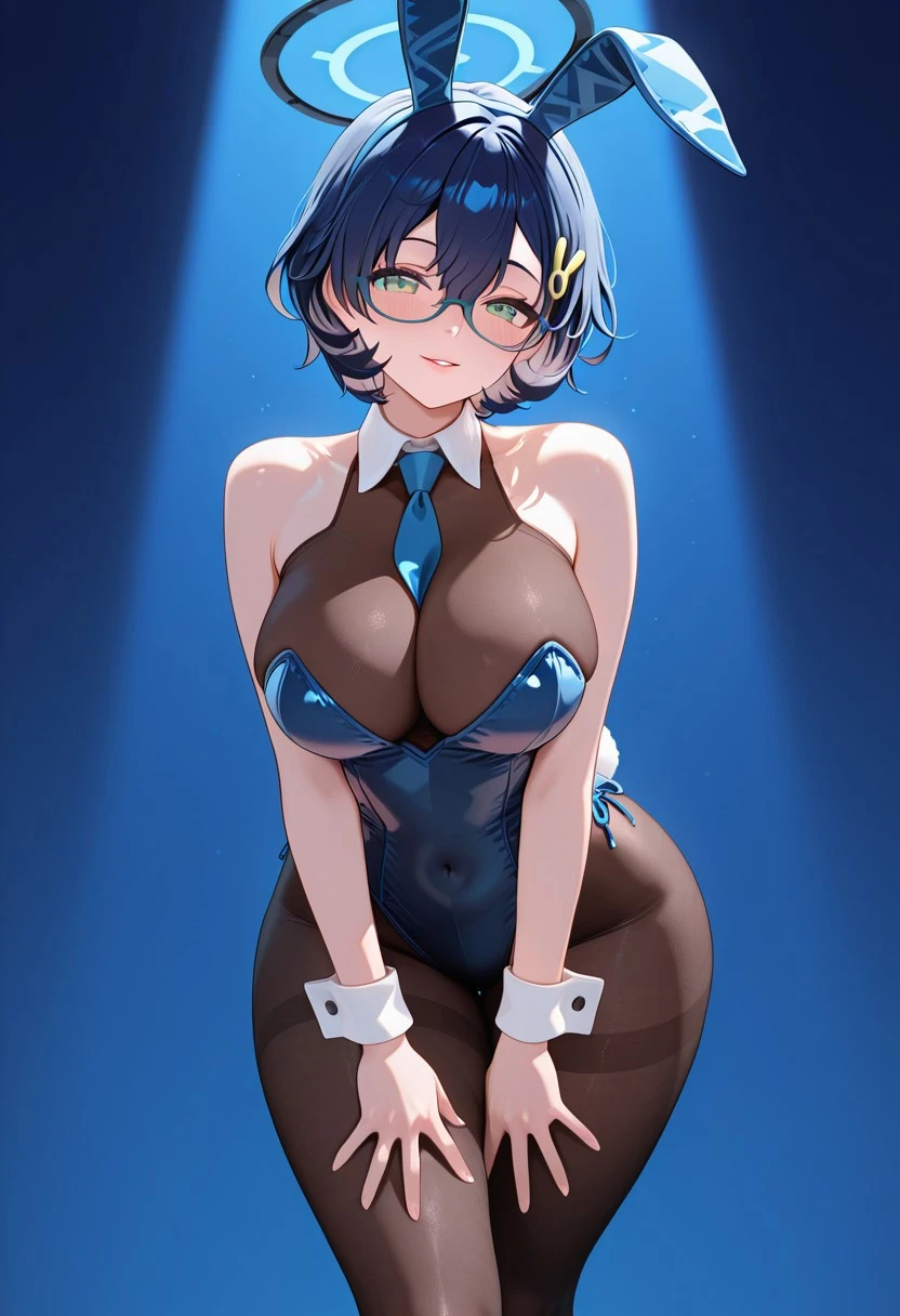 ChhrBnGrlB,green eyes,blue hair,short hair,hair between eyes,halo,glasses,blue-framed eyewear,bunny hair ornament,large breasts,cleavage,covered navel,bare shoulders,animal ears,rabbit ears,fake animal ears,detached collar,blue necktie,necktie between breasts,wrist cuffs,strapless leotard,thighband pantyhose,blue leotard,black pantyhose,see-through cleavage,highleg leotard,bodystocking,high heels,blue footwear,sandals,Bunny Girl White (Without Jacket)