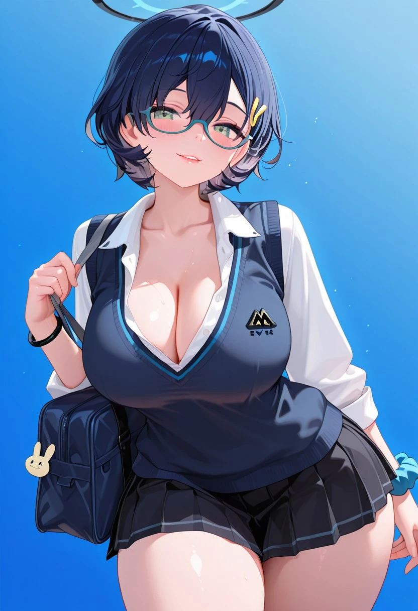 ChhrCsl,green eyes,blue hair,short hair,hair between eyes,halo,glasses,blue-framed eyewear,bunny hair ornament,large breasts,cleavage,collarbone,school uniform,collared shirt,open collar,long sleeves,white shirt,blue sweater vest,pleated skirt,black skirt,white socks,loose socks,white footwear,sneakers,bracelet,wrist scrunchie,bag,Pajamas: