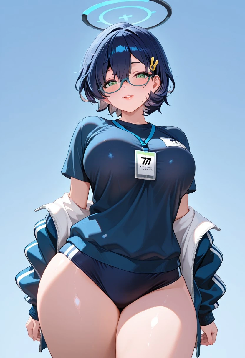 ChhrTrk,green eyes,blue hair,short hair,hair between eyes,halo,glasses,blue-framed eyewear,bunny hair ornament,large breasts,blue shirt,gym shirt,short sleeves,blue jacket, track jacket,long sleeves,off shoulder,open jacket,jacket partially removed,gym uniform,blue buruma,lanyard,id card,white socks,blue footwear,sneakers,Magical Girl: