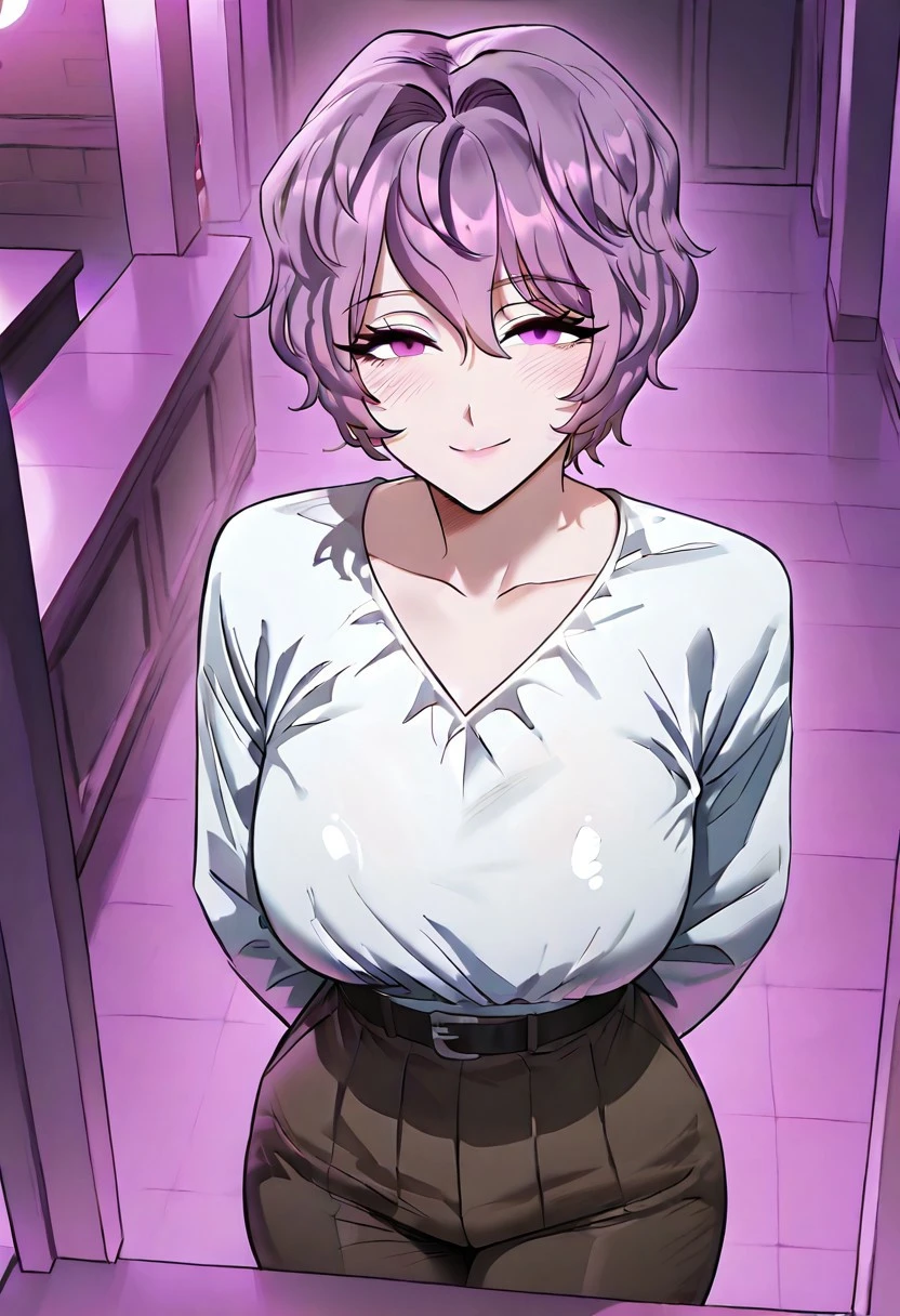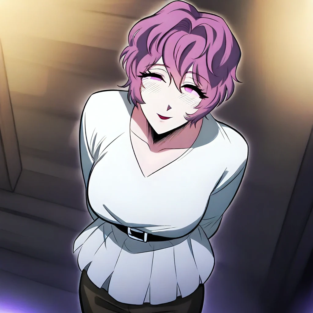 (( <lora:eril_m1c8:1> , eril_m1c8, beautiful pink eyes, clear eyes, bright pupils, beautiful eyes, beautiful purple hair, beautiful messy short hair, bangs, huge and shaggy breasts, short busty woman, thin waist, wide hips, beautiful skin, natural beauty, extraordinary beautiful woman, attractive woman, super sexy woman, lustful body, sexy woman with seductive obscene body, sensual body, voluptuous body, sexy beauty, ))