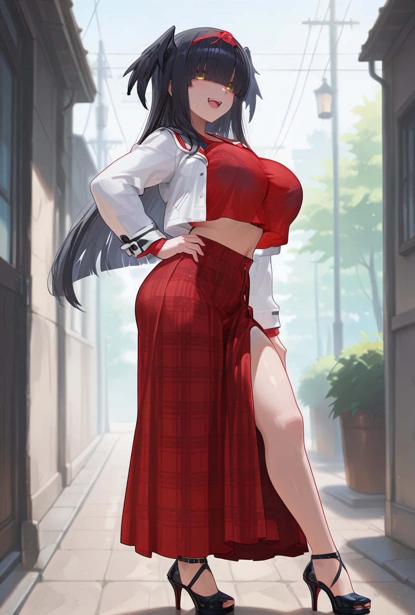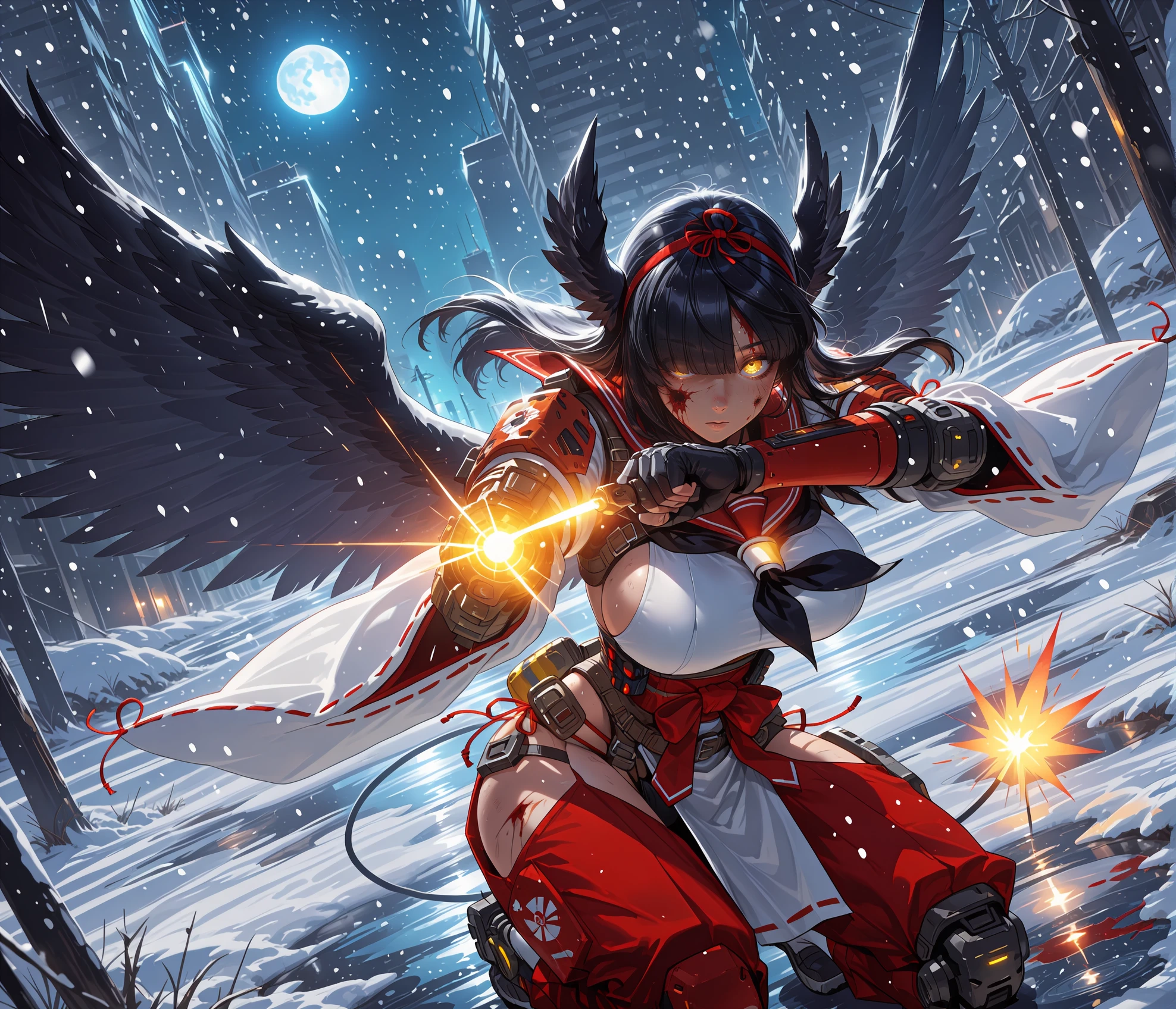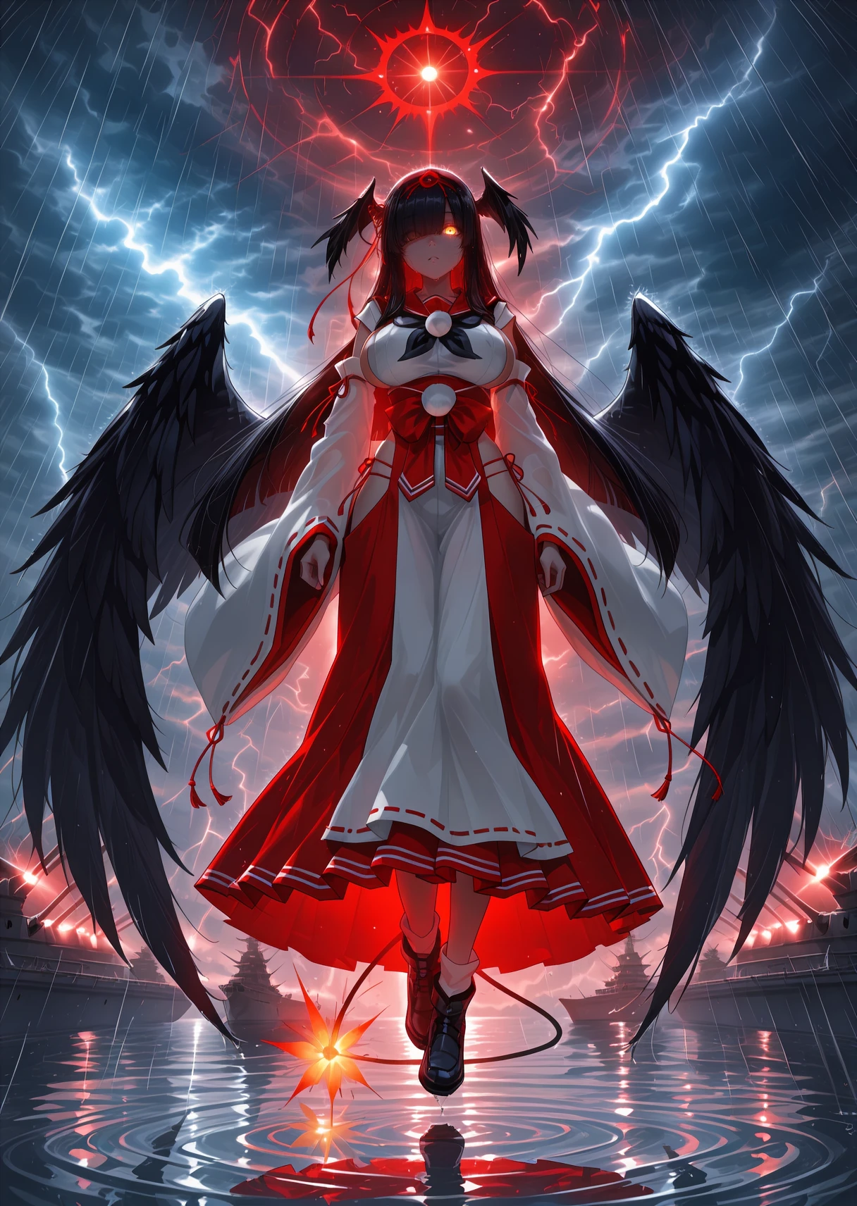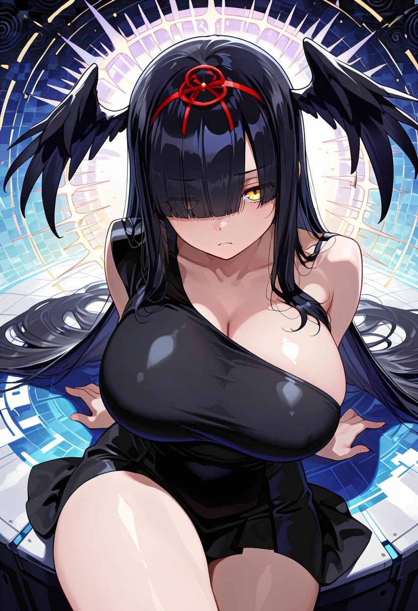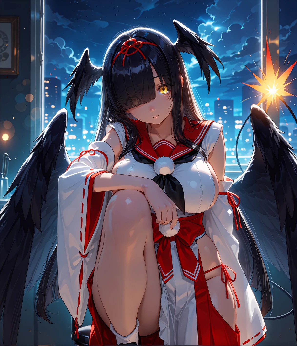 h1r0base, yellow eyes, black hair, long hair, blunt bangs, head wings, hair over one eye, eyes visible through hair, red hairband, large breasts, sideboob, sailor collar, black neckerchief, detached sleeves, wide sleeves, long sleeves, ribbon-trimmed sleeves, two tone hakama, white hakama, red hakama, red hakama skirt, hip vent, red obi, red side-tie panties, ribbon trim, white socks, black footwear, black wings, feathered wings, fuse tail,